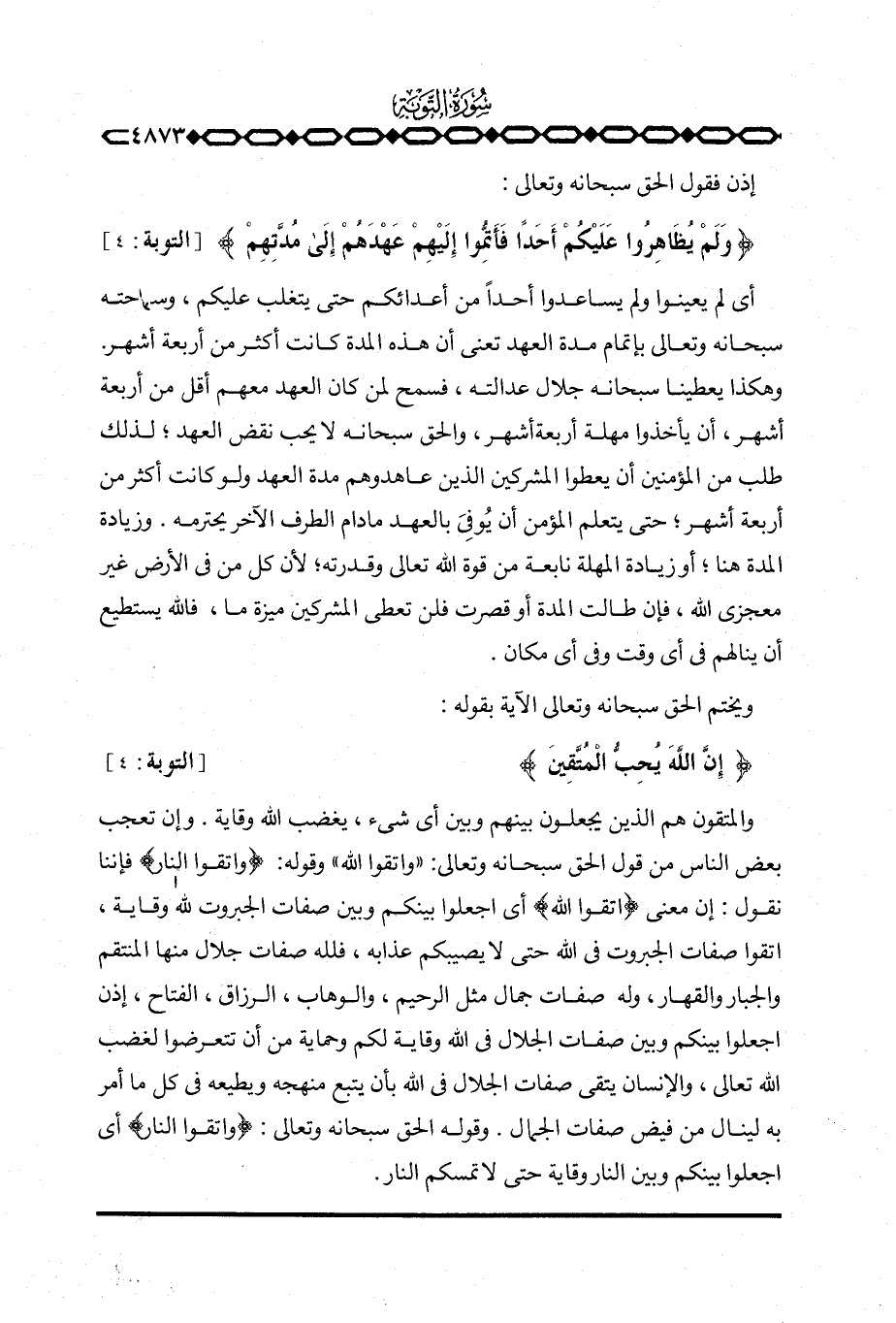 أي لم يعينوا ولم يساعدوا أحداً من أعدائكم حتى يتغلب عليكم، وسماحته سبحانه وتعالى بإتمام مدة العهد تعني أن هذه المدة كانت أكثر من أربعة أشهر. وهكذا يعطينا سبحانه جلال عدالته، فسمح لمن كان العهد معهم أقل من أربعة أشهر، أن يأخذوا مهلة أربعة أشهر، والحق سبحانه لا يحب نقض العهد؛ لذلك طلب من المؤمنين أن يعطوا المشركين الذين عاهدوهم مدة العهد ولو كانت أكثر من أربعة أشهر؛ حتى يتعلم المؤمن أن يُوفِيَ بالعهد ما دام الطرف الآخر يحترمه. وزيادة المدة هنا؛ أو زيادة المهلة نابعة من قوة الله تعالى وقدرته؛ لأن كل من في الأرض غير معجزي الله، فإن طالت المدة أو قصرت فلن تعطي المشركين ميزة ما، فالله يستطيع أن ينالهم في أي وقت وفي أي مكان.
