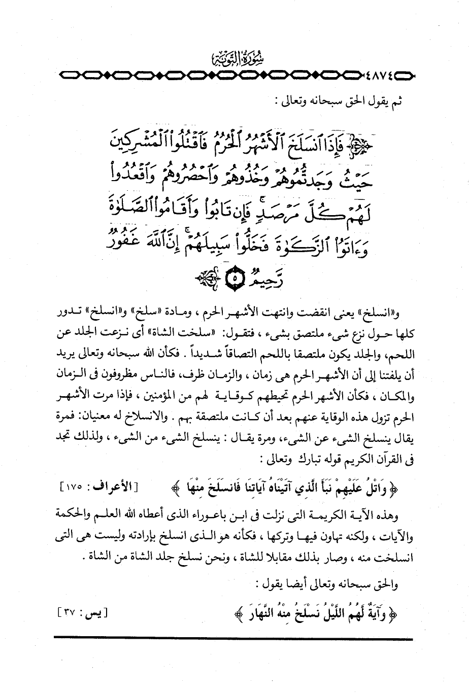 و «انسلخ» يعني انقضت وانتهت الأشهر الحرم، ومادة «سلخ» و «انسلخ» تدور كلها حول نزع شيء ملتصق بشيء، فتقول: «سلخت الشاة» أي نزعت الجلد عن اللحم، والجلد يكون ملتصقا باللحم شديداً. فكأن الله سبحانه وتعالى يريد أن يلفتنا إلى أن الأشهر الحرم هي زمان، والزمان ظرف، فالناس مظروفون في الزمان والمكان، فكأن الأشهر الحرم تحيطهم كوقاية لهم من المؤمنين، فإذا مرت الأشهر الحرم تزول هذه الوقاية عنهم بعد أن كانت ملتصقة بهم، والانسلاخ له معنيان: فمرة يقال ينسلخ الشيء عن الشيء، ومرة يقال: ينسلخ الشيء من الشيء، ولذلك تجد في القرآن الكريم تبارك وتعالى: {واتل عَلَيْهِمْ نَبَأَ الذيءَاتَيْنَاهُءَايَاتِنَا فانسلخ مِنْهَا} [الأعراف: 175] .