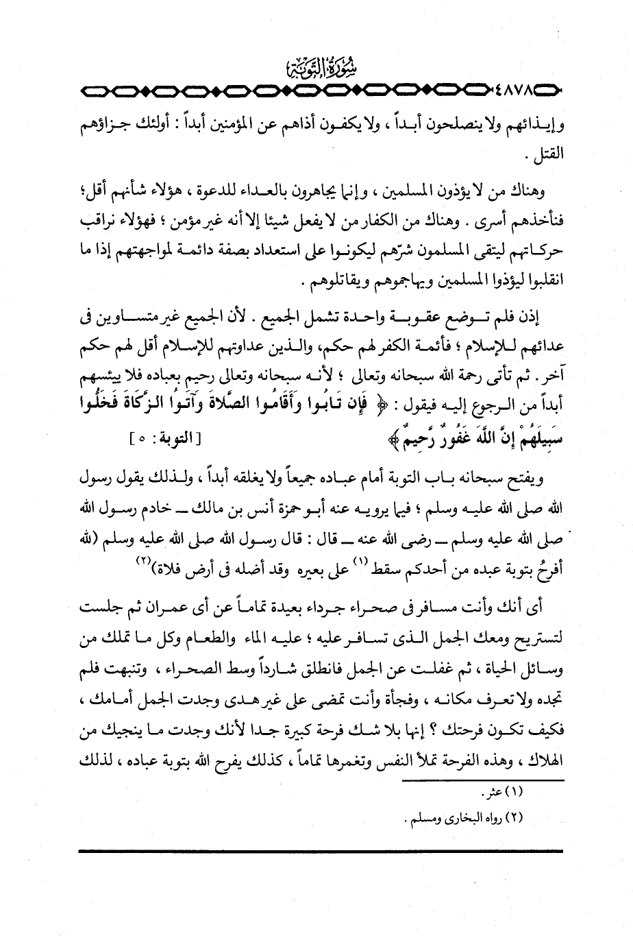 أي أنك وأنت مسافر في صحراء جرداء بعيدة تماماً عن أي عمران ثم جلست لتستريح ومعك الجمل الذي تسافر عليه؛ عليه الماء والطعام وكل ما تملك من وسائل الحياة، ثم غفلت عن الجمل فانطلق شارداً وسط الصحراء، وتنبهت فلم تجده ولا تعرف مكانه، وفجأة وأنت تمضي على غير هدى وجدت الجمل أمامك، فكيف تكون فرحتك؟ إنها بلا شك فرحة كبيرة جدا لأنك وجدت ما ينجيك من الهلاك، وهذه الفرحة تملأ النفس وتغمرها تماماً، كذلك يفرح الله بتوبة عباده، لذلك