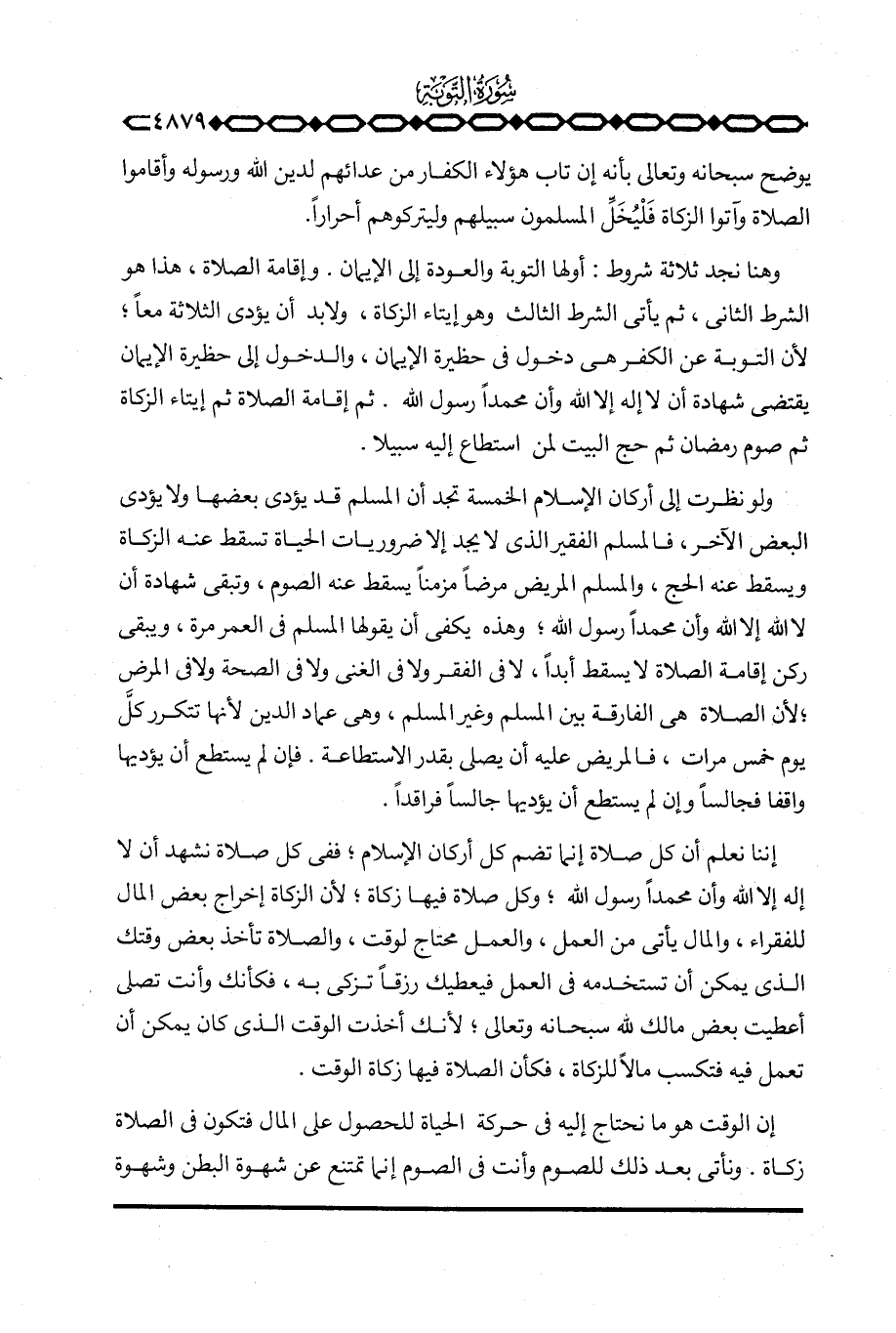 وهنا نجد ثلاثة شروط: أولها التوبة والعودة إلى الإيمان. وإقامة الصلاة، هذا هو الشرط الثاني، ثم يأتي الشرط الثالث وهو إيتاء الزكاة، ولا بد أن يؤدي الثلاثة معاً؛ لأن التوبة عن الكفر هي دخول في حظيرة الإيمان، والدخول إلى حظيرة الإيمان يقتضي شهادة أن لا إله إلا الله وأن محمداً رسول الله. ثم إقامة الصلاة ثم إيتاء الزكاة ثم صوم رمضان ثم حج البيت لمن استطاع إليه سبيلا.