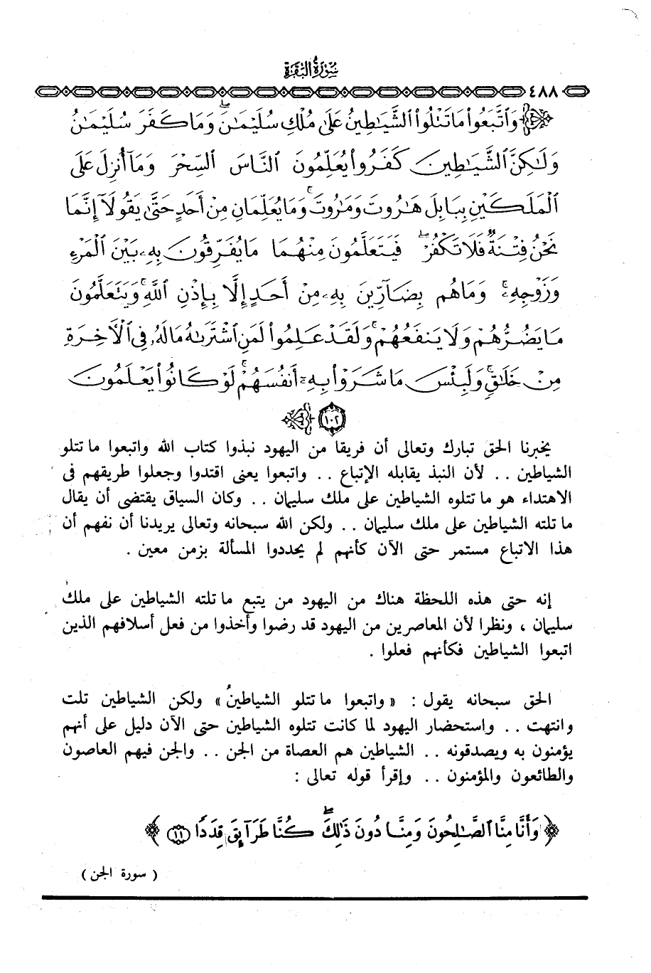 إنه حتى هذه اللحظة هناك من اليهود من يتبع ما تلته الشياطين على ملك سليمان، ونظرا لأن المعاصرين من اليهود قد رضوا وأخذوا من فعل أسلافهم الذين اتبعوا الشياطين فكأنهم فعلوا.