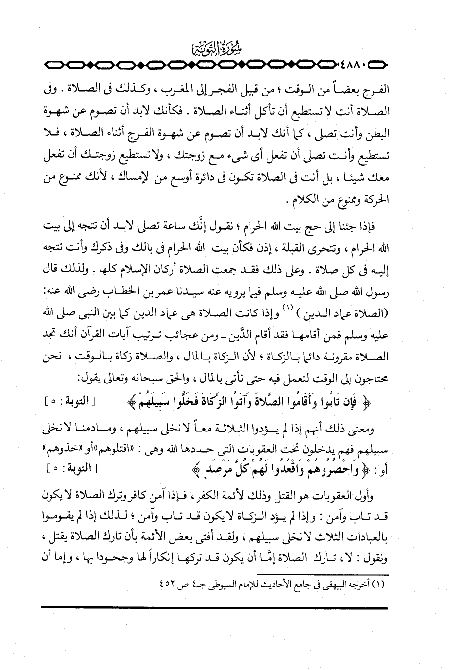 فإذا جئنا إلى حج بيت الله الحرام؛ نقول إنَّك ساعة تصلي لا بد أن تتجه إلى بيت الله الحرام، وتتحرى القبلة، إذن فكأن بيت الله الحرام في بالك وفي ذكرك وأنت تتجه إليه في كل صلاة. وعلى ذلك فقد جمعت الصلاة أركان الإسلام كلها. ولذلك قال رسول الله صَلَّى اللَّهُ عَلَيْهِ وَسَلَّم َ فيما يرويه عنه سيدنا عمر بن الخطاب رَضِيَ اللَّهُ عَنْه: «الصلاة عماد الدين» وإذا كانت الصلاة هي عماد الدين كما بين النبي صَلَّى اللَّهُ عَلَيْهِ وَسَلَّم َ فمن أقامها فقد أقام الدَّين - ومن عجائب ترتيب آيات القرآن أنك تجد الصلاة مقرونة دائما بالزكاة؛ لأن الزكاة بالمال، والصلاة زكاة بالوقت، نحن محتاجون إلى الوقت لنعمل فيه حتى نأتي بالمال، والحق سبحانه وتعالى يقول: