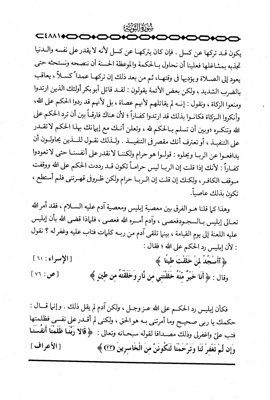 يكون قد تركها عن كسل. فإن كان يتركها عن كسل لأنه لا يقدر على نفسه والدنيا تجذبه بمشاغلها فعلينا أن نحاول بالحكمة والموعظة الحسنة أن ننصحه ونستحثه حتى يعود إلى الصلاة ويؤديها في وقتها، ثم من بعد ذلك إن تركها عمداً كسلاً، يعاقب بالضرب الشديد، ولكن بعض الأئمة يقولون: لقد قاتل أبو بكر أولئك الذين ارتدوا ومنعوا الزكاة، ونقول: إنه لم يقاتلهم لأنهم عصاة، بل لأنهم قد ردوا الحكم على الله، وأنكروا الزكاة فكانوا بذلك قد ارتدوا كفاراً؛ لأن هناك فارقاً بين أن ترد الحكم على الله وتنكره؛ وبين أن تسلم بالحكم لله، وتعلن أنك مع إيمانك بهذا الحكم لا تقدر على التنفيذ، أو تعترف أنك مقصر في التنفيذ. ولذلك نقول للذين يحاولون أن يدافعوا عن الربا ويحلوه: قولوا هو حرام ولكننا لا نقدر على أنفسنا حتى لا تعودوا كفاراً: لأنك إذا قلت إن الربا ليس حراماً تكون قد رددت الحكم على الله ووقفت موقف الكافر، ولكنك إن قلت إن الربا حرام ولكن ظروفي قهرتني فلم أستطع، تكون بذلك عاصياً.