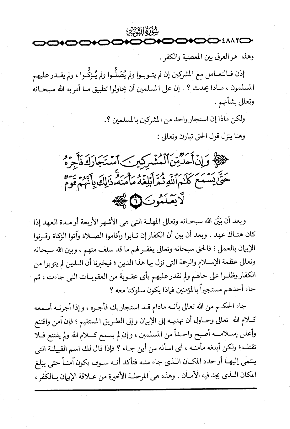 وبعد أن بَيَّن الله سبحانه وتعالى المهلة التي هي الأشهر الأربعة أو مدة العهد إذا كان هناك عهد. وبعد أن بين أن الكفار إن تابوا وأقاموا الصلاة وآتوا الزكاة وقرنوا الإيمان بالعمل؛ فالحق سبحانه وتعالى يغفر لهم ما قد سلف منهم، وبين الله سبحانه وتعالى عظمة الإسلام والرحمة التي نزل بها هذا الدين؛ فيخبرنا أن الذين لم يتوبوا من الكفار وظلوا على حالهم ولم نقدر عليهم بأي عقوبة من العقوبات التي جاءت، ثم جاء أحدهم مستجيراً بالمؤمنين فماذا يكون سلوكنا معه؟
