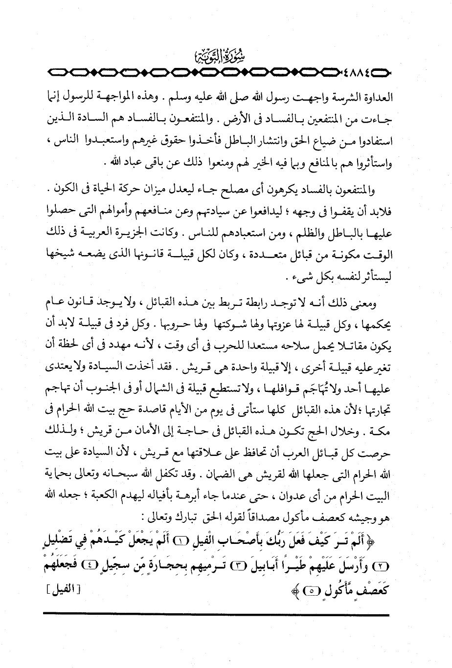 ومعنى ذلك أنه لا توجد رابطة تربط بين هذه القبائل، ولا يوجد قانون عام يحكمها، وكل قبيلة لها عزوتها ولها شوكتها ولها حروبها. وكل فرد في قبيلة لا بد أن يكون مقاتلا يحمل سلاحه مستعدا للحرب في أي وقت، لأنه مهدد في أي لحظة أن تغير عليه قبيلة أخرى، إلا قبيلة واحدة هي قريش. فقد أخذت السيادة ولا يعتدي عليها أحد ولا تُهَاجَم قوافلها، ولا تستطيع قبيلة في الشمال أو في الجنوب أن تهاجم تجارتها؛ لأن هذه القبائل كلها ستأتي في يوم من الأيام قاصدة حج بيت الله الحرام في مكة. وخلال الحج تكون هذه القبائل في حاجة إلى الأمان من قريش؛ ولذلك حرصت كل قبائل العرب أن تحافظ على علاقتها مع قريش، لأن السيادة على بيت الله الحرام التي جعلها الله لقريش هي الضمان. وقد تكفل الله سبحانه وتعالى بحماية البيت الحرام من أي عدوان، حتى عندما جاء أبرهة بأفياله ليهدم الكعبة؛ جعله الله هو وجيشه كعصف مأكول مصداقاً لقوله الحق تبارك وتعالى: {أَلَمْ تَرَ كَيْفَ فَعَلَ رَبُّكَ بِأَصْحَابِ الفيل أَلَمْ يَجْعَلْ كَيْدَهُمْ فِي تَضْلِيلٍ وَأَرْسَلَ عَلَيْهِمْ طَيْراً أَبَابِيلَ تَرْمِيهِم بِحِجَارَةٍ مِّن سِجِّيلٍ فَجَعَلَهُمْ كَعَصْفٍ مَّأْكُولٍ} [الفيل: 1 - 5] .
