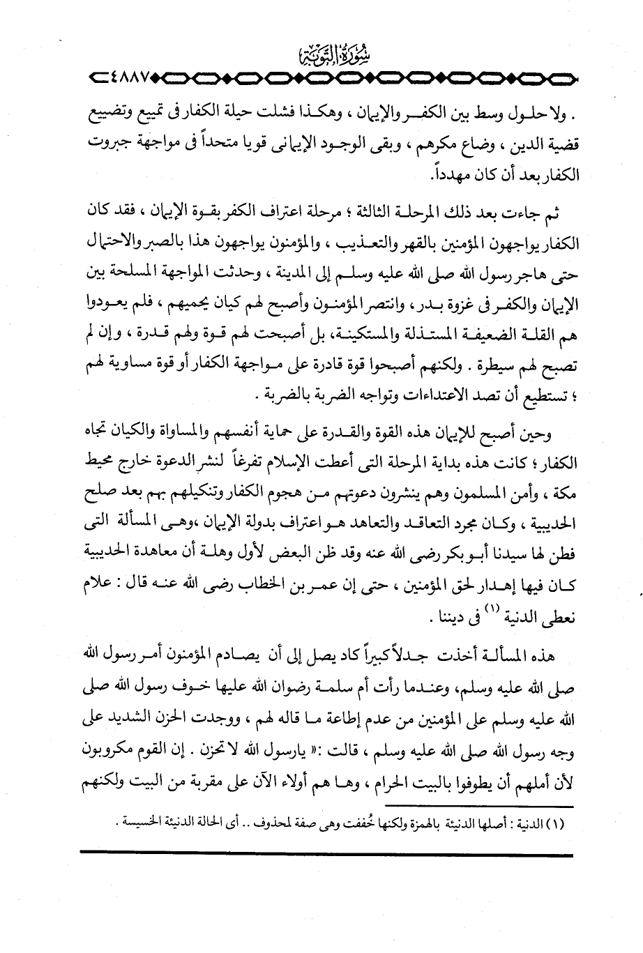 ثم جاءت بعد ذلك المرحلة الثالثة؛ مرحلة اعتراف الكفر بقوة الإيمان، فقد كان الكفار يواجهون المؤمنين بالقهر والتعذيب، والمؤمنون يواجهون هذا بالصبر والاحتمال حتى هاجر رسول الله صَلَّى اللَّهُ عَلَيْهِ وَسَلَّم َ إلى المدينة، وحدثت المواجهة المسلحة بين الإيمان والكفر في غزوة بدر، وانتصر المؤمنون وأصبح لهم كيان يحميهم، فلم يعودوا هم القلة الضعيفة المستذلة والمستكينة، بل أصبحت لهم قوة ولهم قدرة، وإن لم تصبح لهم سيطرة. ولكنهم أصبحوا قوة قادرة على مواجهة الكفار أو قوة مساوية لهم؛ تستطيع أن تصد الاعتداءات وتواجه الضربة بالضربة.