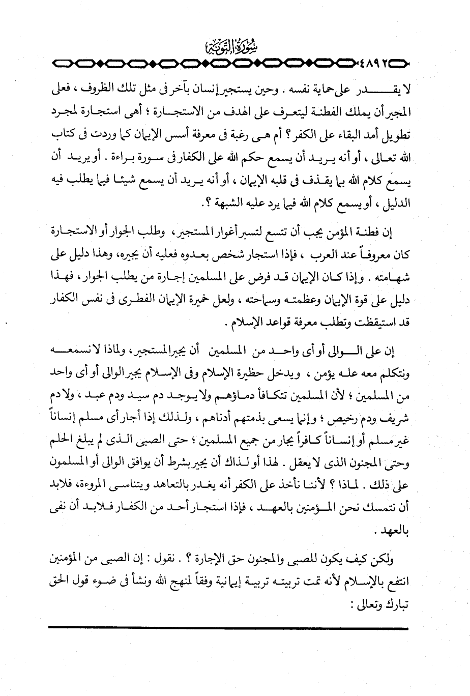 لا يقدر على حماية نفسه. وحين يستجير إنسان بآخر في مثل تلك الظروف، فعلى المجير أن يملك الفطنة ليتعرف على الهدف من الاستجارة؛ أهي استجارة لمجرد تطويل أمد البقاء على الكفر؟ أم هي رغبة في معرفة أسس الإيمان كما وردت في كتاب الله تعالى، أو أنه يريد أن يسمع حكم الله على الكفار في سورة براءة.