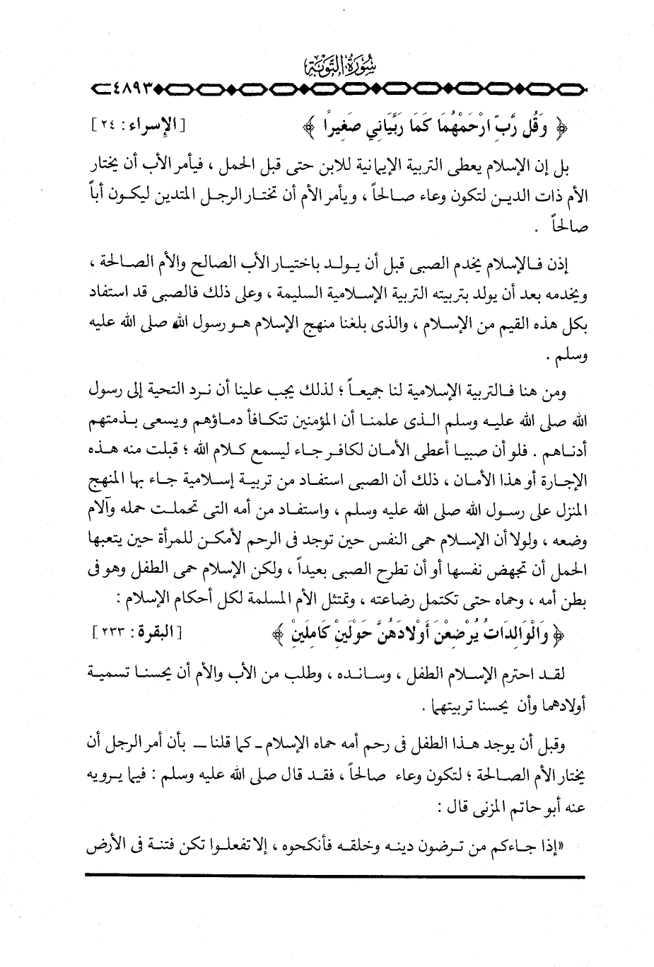 ومن هنا فالتربية الإسلامية لنا جميعاً؛ لذلك يجب علينا أن نرد التحية إلى رسول الله صَلَّى اللَّهُ عَلَيْهِ وَسَلَّم َ الذي علمنا أن المؤمنين تتكافأ دماؤهم ويسعى بذمتهم أدناهم. فلو أن صبيا أعطى الأمان لكافر جاء ليسمع كلام الله؛ قبلت منه هذه الإجارة أو هذا الأمان، ذلك أن الصبي استفاد من تربية إسلامية جاء بها المنهج المنزل على رسول الله صَلَّى اللَّهُ عَلَيْهِ وَسَلَّم َ، واستفاد من أمه التي تحملت حمله وآلام وضعه، ولولا أن الإسلام حمى النفس حين توجد في الرحم لأمكن للمرأة حين يتعبها الحمل أن تجهض نفسها أو أن تطرح الصبي بعيداً، ولكن الإسلام حمى الطفل وهو في بطن أمه، وحماه حتى تكتمل رضاعته، وتتمثل الأم المسلمة لكل أحكام الإسلام: