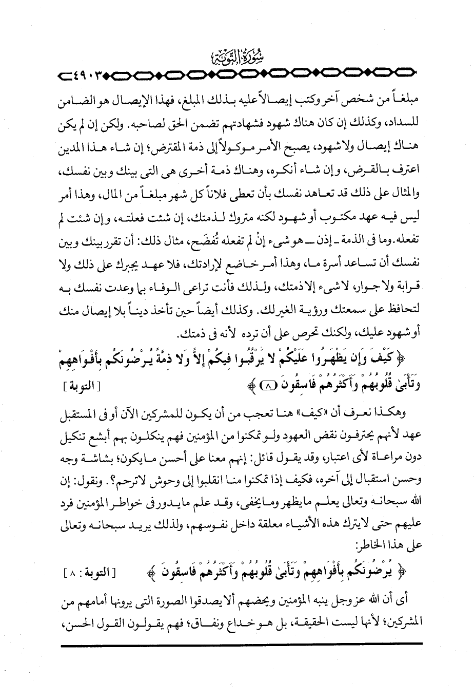 وهكذا نعرف أن «كيف» هنا تعجب من أن يكون للمشركين الآن أو في المستقبل عهد لأنهم يحترفون نقض العهود ولو تمكنوا من المؤمنين فهم ينكلون بهم أبشع تنكيل دون مراعاة لأي اعتبار، وقد يقول قائل: إنهم معنا على أحسن ما يكون؛ بشاشة وجه وحسن استقبال إلى آخره، فكيف إذا تمكنوا منا انقلبوا إلى وحوش لا ترحم؟ . ونقول: إن الله سبحانه وتعالى يعلم ما يظهر وما يخفي، وقد علم ما يدور في خواطر المؤمنين فرد عليهم حتى لا يترك هذه الأشياء معلقة داخل نفوسهم، ولذلك يريد سبحانه وتعالى على هذا الخاطر: