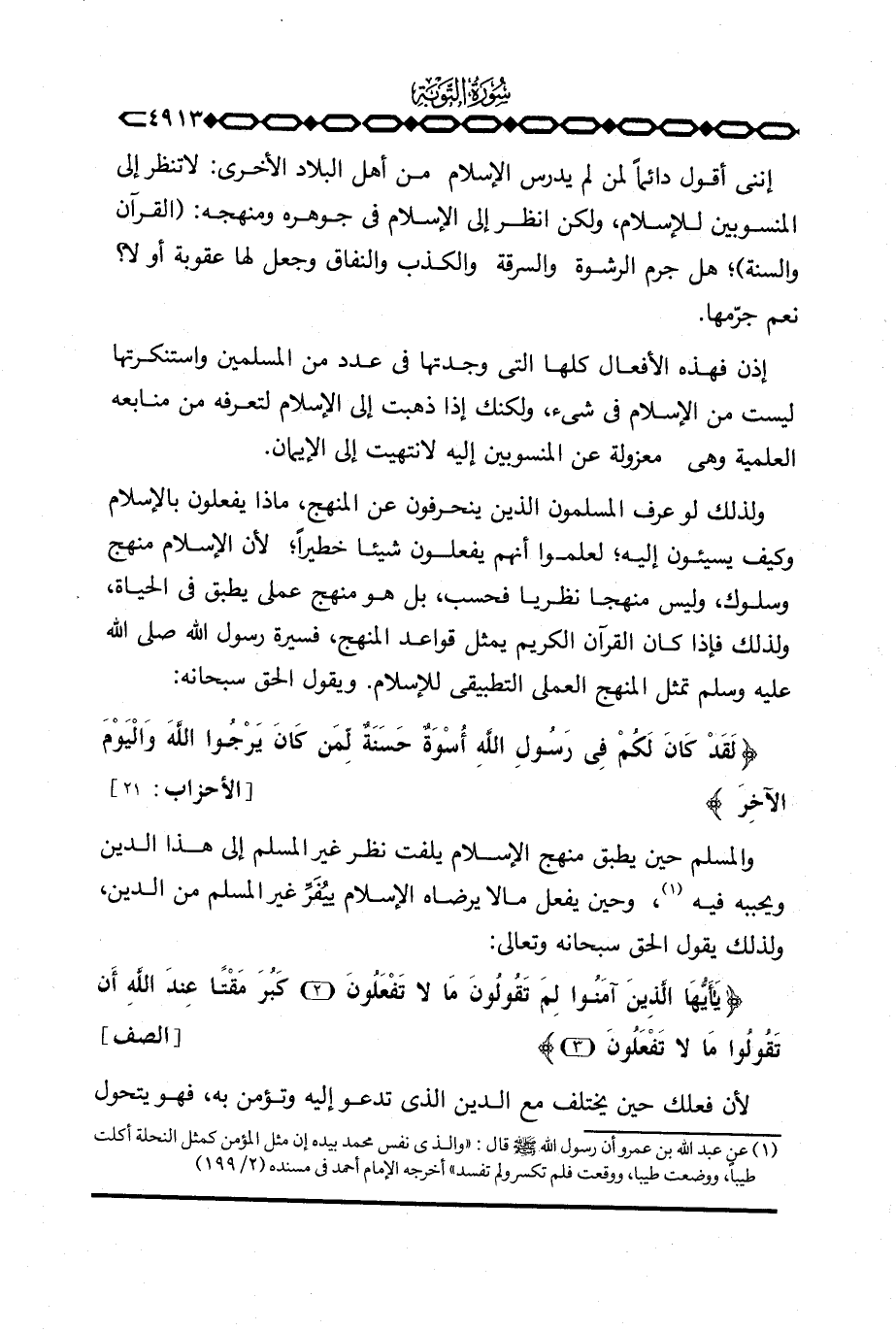 إنني أقول دائماً لمن لم يدرس الإسلام من أهل البلاد الأخرى: لا تنظر إلى المنسوبين للإسلام، ولكن انظر إلى الإسلام في جوهره ومنهجه: (القرآن والسنة) ؛ هل جرم الرشوة والسرقة والكذب والنفاق وجعل لها عقوبة أو لا؟ نعم جرّمها.