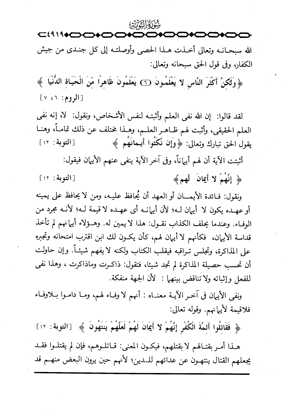 لقد قالوا: إن الله نفى العلم وأثبته لنفس الأشخاص، ونقول: لا، إنه نفى العلم الحقيقي، وأثبت لهم ظاهر العلم، وهذا مختلف عن ذلك تماماً، وهنا يقول الحق تبارك وتعالى: {وَإِن نكثوا أَيْمَانَهُم} [التوبة: 12] .