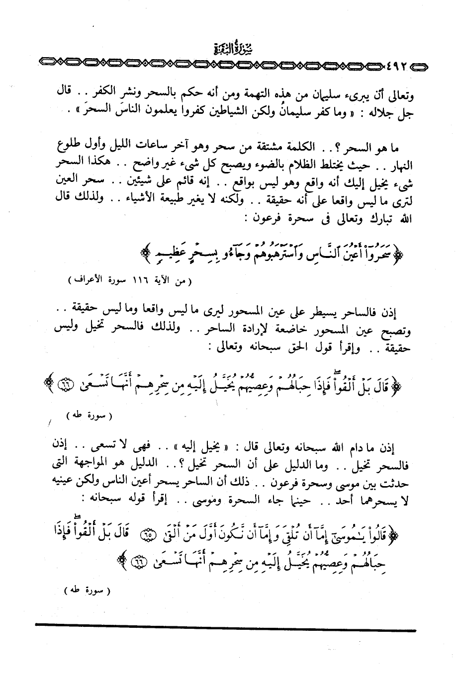 إذن مادام الله سبحانه وتعالى قال: {يُخَيَّلُ إِلَيْهِ} . . فهي لا تسعى. . إذن فالسحر تخيل. . وما الدليل على أن السحر تخيل؟ . . الدليل هو المواجهة التي حدثت بين موسى وسحرة فرعون. . ذلك أن الساحر يسحر أعين الناس ولكن عينيه لا يسحرهما أحد. . حينما جاء السحرة وموسى. . اقرأ قوله سبحانه: {قَالُواْ ياموسى إِمَّآ أَن تُلْقِيَ وَإِمَّآ أَن نَّكُونَ أَوَّلَ مَنْ ألقى قَالَ بَلْ أَلْقُواْ فَإِذَا حِبَالُهُمْ وَعِصِيُّهُمْ يُخَيَّلُ إِلَيْهِ مِن سِحْرِهِمْ أَنَّهَا تسعى} [طه: 65 - 66]