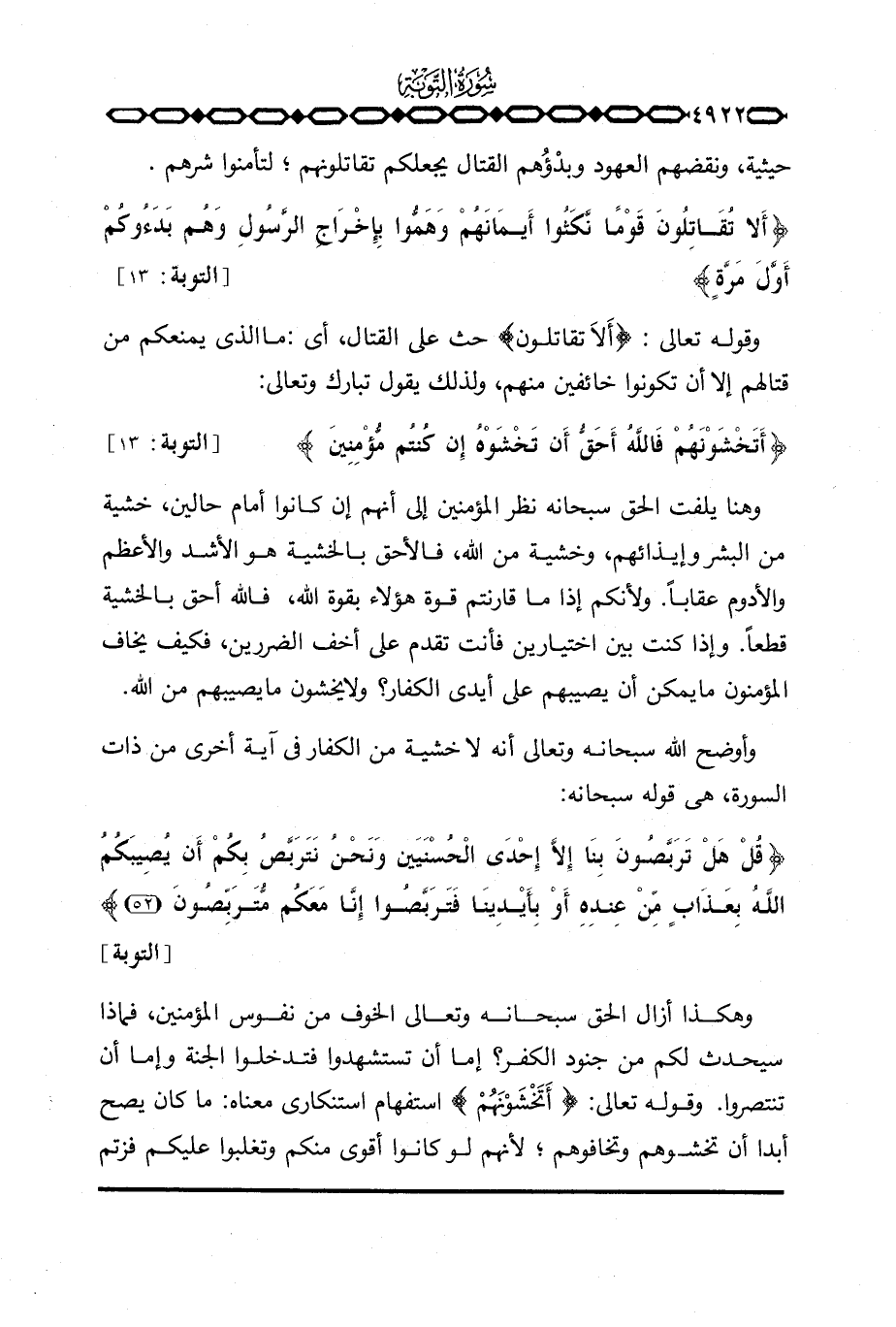 وأوضح الله سبحانه وتعالى أنه لا خشية من الكفار في آية أخرى من ذات السورة، هي قوله سبحانه: {قُلْ هَلْ تَرَبَّصُونَ بِنَآ إِلاَّ إِحْدَى الحسنيين وَنَحْنُ نَتَرَبَّصُ بِكُمْ أَن يُصِيبَكُمُ الله بِعَذَابٍ مِّنْ عِندِهِ أَوْ بِأَيْدِينَا فتربصوا إِنَّا مَعَكُمْ مُّتَرَبِّصُونَ} [التوبة: 52] .