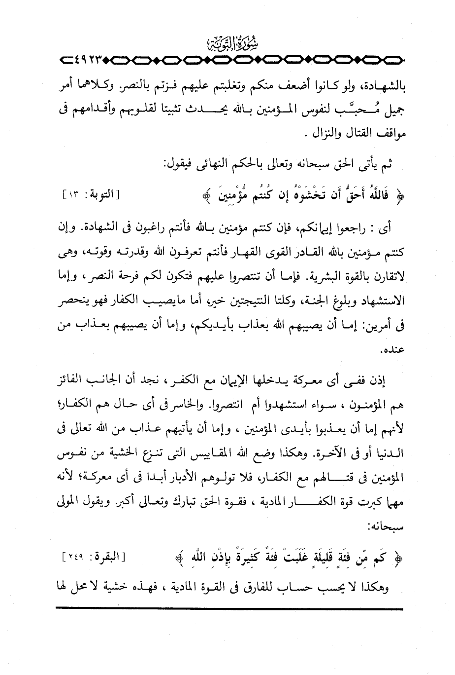 إذن ففي أي معركة يدخلها الإيمان مع الكفر، نجد أن الجانب الفائز هم المؤمنون، سواء استشهدوا أم انتصروا. والخاسر في أي حال هم الكفار؛ لأنهم إما أن يعذبوا بأيدي المؤمنين، وإما أن يأتيهم عذاب من الله تعالى في الدنيا أو في الآخرة. وهكذا وضع الله المقاييس التي تنزع الخشية من نفوس المؤمنين في قتالهم مع الكفار، فلا تولوهم الأدبار أبدا في أي معركة؛ لأنه مهما كبرت قوة الكفار المادية، فقوة الحق تبارك وتعالى أكبر. ويقول المولى سبحانه: {كَم مِّن فِئَةٍ قَلِيلَةٍ غَلَبَتْ فِئَةً كَثِيرَةً بِإِذْنِ الله} [البقرة: 249] .