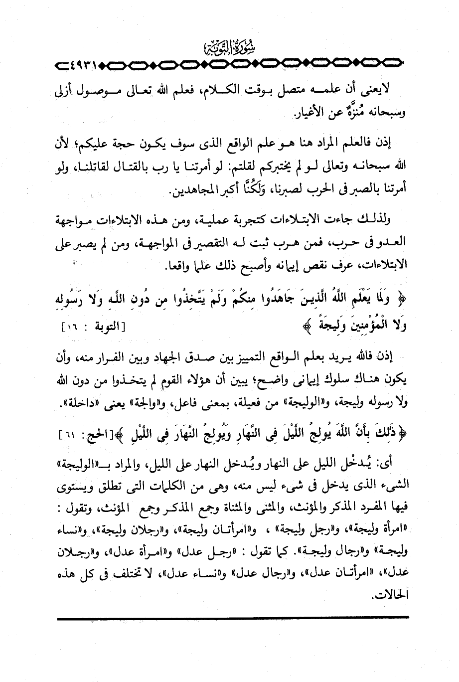 أي: يُدخْل الليل على النهار ويُدخل النهار على الليل، والمراد ب «الوليجة» الشيء الذي يدخل في شيء ليس منه، وهي من الكلمات التي تطلق ويستوي فيها المفرد المذكر والمؤنث، والمثنى والمثناة وجمع المذكر وجمع المؤنث، وتقول: «امرأة وليجة» و «رجال وليجة» . كما تقول: «رجل عدل» و «امرأة عدل» ، و «رجلان عدل» ، «امرأتان عدل» ، و «رجال عدل» و «نساء عدل» ، لا تختلف في كل هذه الحالات.