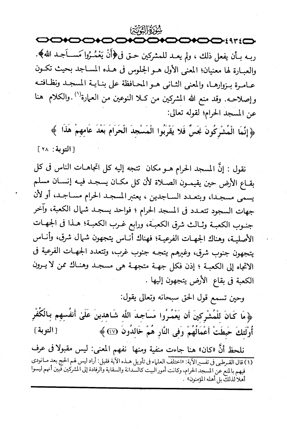 ربه بأن يفعل ذلك، ولم يعد للمشركين حق في {أَن يَعْمُرُواْ مَسَاجِدَ الله} . والعبارة لها معنيان؛ المعنى الأول هو الجلوس في هذه المساجد بحيث تكون عامرة بزوارها، والمعنى الثاني هو المحافظة على بناية المسجد ونظافته وإصلاحه. وقد منع الله المشركين من كلا النوعين من العمارة. والكلام هنا عن المسجد الحرام؛ لقوله تعالى: {إِنَّمَا المشركون نَجَسٌ فَلاَ يَقْرَبُواْ المسجد الحرام بَعْدَ عَامِهِمْ هذا} [التوبة: 28] .