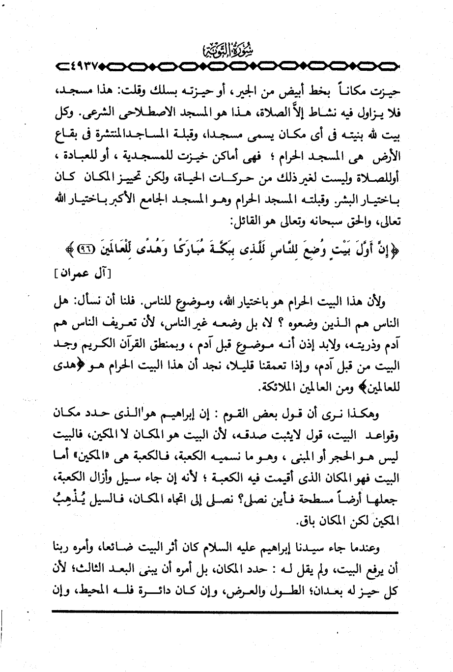 وهكذا نرى أن قول بعض القوم: إن إبراهيم هو الذي حدد مكان وقواعد البيت، قول لا يثبت صدقه، لأن البيت هو المكان لا المكين، فالبيت ليس هو الحجر أو المبنى، وهو ما نسميه الكعبة، فالكعبة هي «المكين» أما البيت فهو المكان الذي أقيمت فيه الكعبة؛ لأنه إن جاء سيل وأزال الكعبة، جعلها أرضاً مسطحة فأين نصلي؟ نصلي إلى اتجاه المكان، فالسيل يُذْهِبُ المكين لكن المكان باق.