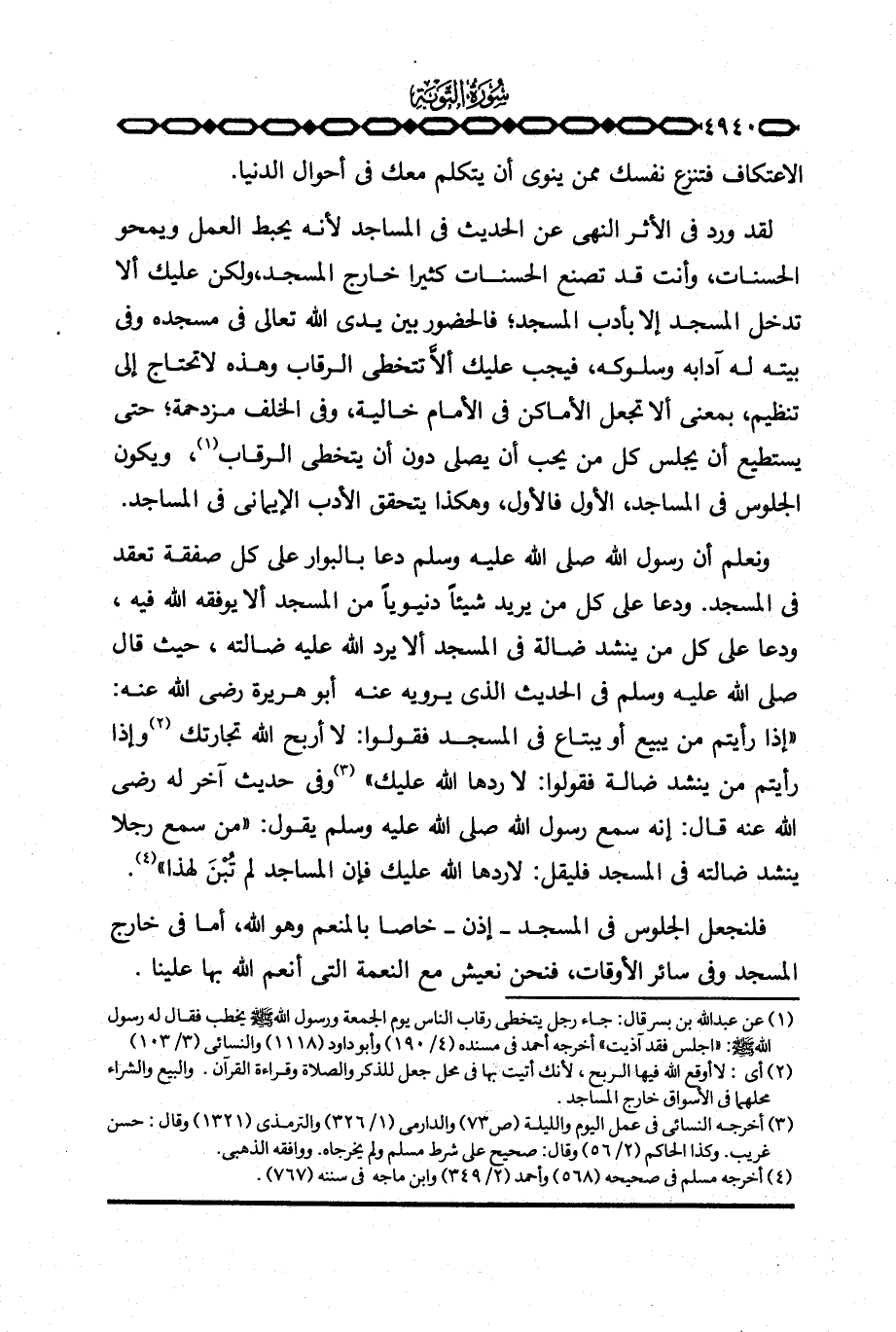 ونعلم أن رسول الله صَلَّى اللَّهُ عَلَيْهِ وَسَلَّم َ دعا بالبوار على كل صفقة تعقد في المسجد. ودعا على كل من يريد شيئاً دنيوياً من السجد ألا يوفقه الله فيه، ودعا على كل من ينشد ضالة في المسجد ألا يرد الله عليه ضالته، حيث قال صَلَّى اللَّهُ عَلَيْهِ وَسَلَّم َ في الحديث الذي يرويه عنه أبو هريرة رَضِيَ اللَّهُ عَنْه: «إذا رأيتم من يبيع أو يبتاع في المسجد فقولوا: لا أربح الله تجارتك وإذا رأيتم من ينشد ضالته فقولوا: لا ردها الله عليك» وفي حديث آخر له رَضِيَ اللَّهُ عَنْه قال: إنه سمع رسول الله صَلَّى اللَّهُ عَلَيْهِ وَسَلَّم َ يقول: «من سمع رجلا ينشد ضالته في المسجد فليقل: لا ردها الله عليك فإن المساجد لم تُبْنَ لهذا» .