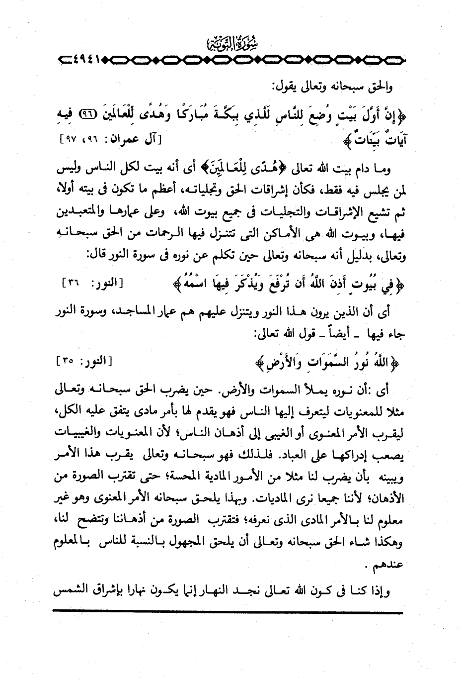 أي أن الذين يرون هذا النور ويتنزل عليهم هم عمار المساجد، وسورة النور جاء فيها - أيضاً - قول الله تعالى: {الله نُورُ السموات والأرض} [النور: 35] .