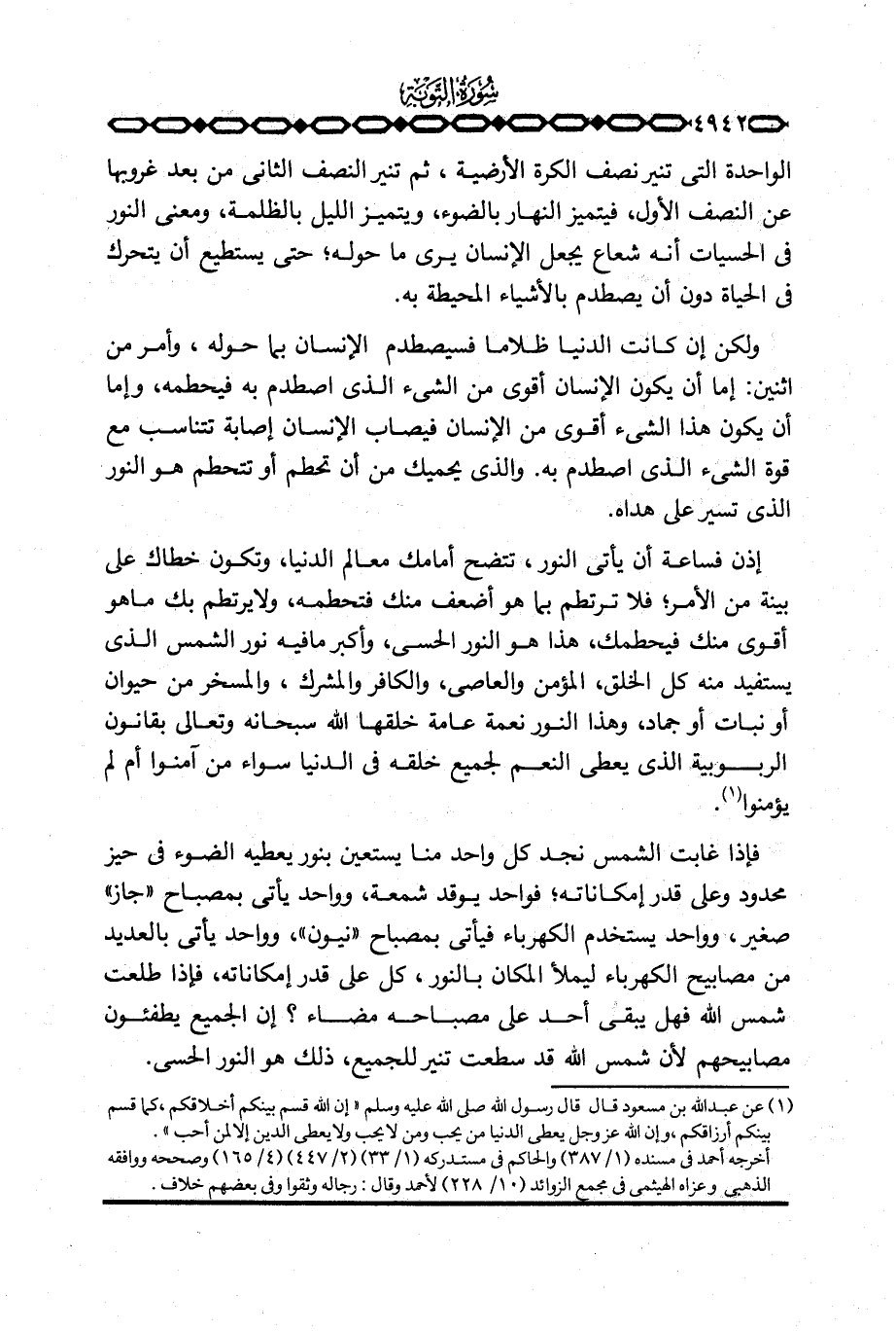 الواحدة التي تنير نصف الكرة الأرضية، ثم تنير النصف الثاني من بعد غروبها عن النصف الأول، فيتميز النهار بالضوء، ويتميز الليل بالظلمة، ومعنى النور في الحسيات أنه شعاع يجعل الإنسان يرى ما حوله؛ حتى يستطيع أن يتحرك في الحياة دون أن يصطدم بالأشياء المحيطة به.