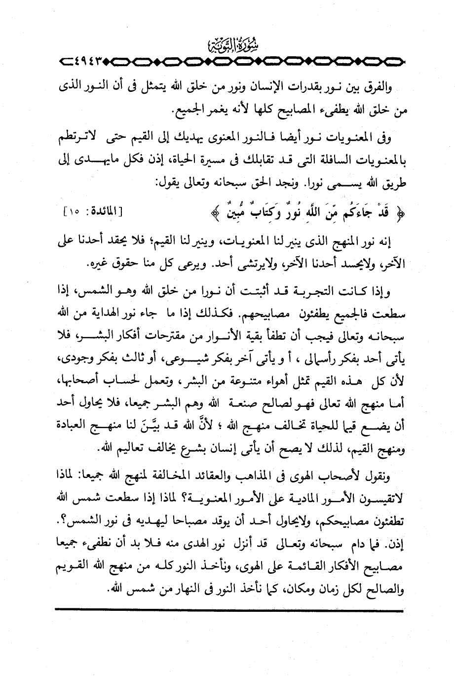 إنه نور المنهج الذي ينير لنا المعنويات، وينير لنا القيم؛ فلا يحقد أحدنا على الآخر، ولا يحسد أحدنا الآخر، ولا يرتشي أحد. ويرعى كل منا حقوق غيره.