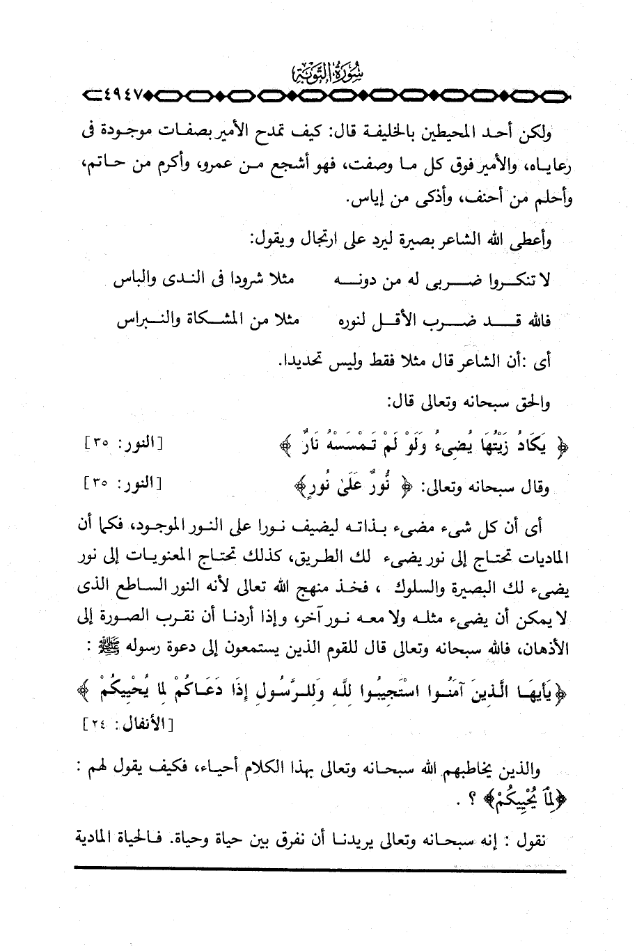 أي أن كل شيء مضيء بذاته ليضيف نورا على النور الموجودة، فكما أن الماديات تحتاج إلى نور يضيء لك الطريق، كذلك تحتاج المعنويات إلى نور يضيء لك البصيرة والسلوك، فخذ منهج الله تعالى لأنه النور الساطع الذي لا يمكن أن يضيء مثله ولا معه نور آخر، وإذا أردنا أن نقرب الصورة إلى الأذهان، فالله سبحانه وتعالى قال للقوم الذين يستمعون إلى دعوة رسوله صَلَّى اللَّهُ عَلَيْهِ وَسَلَّم َ: {ياأيها الذين آمَنُواْ استجيبوا للَّهِ وَلِلرَّسُولِ إِذَا دَعَاكُم لِمَا يُحْيِيكُمْ} [الأنفال: 24] .