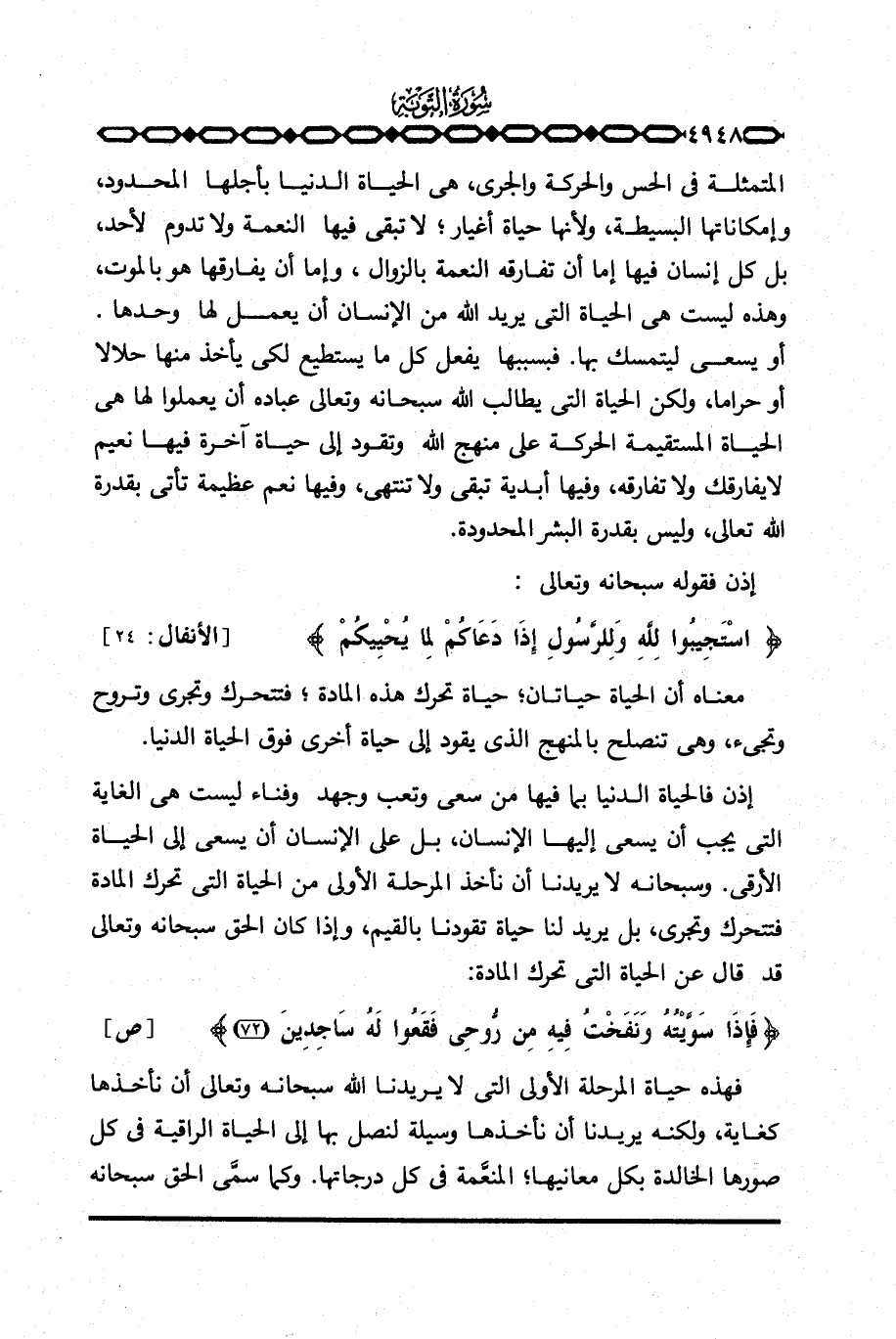 إذن فالحياة الدنيا بما فيها من سعي وتعب وجهد وفناء ليست هي الغاية التي يجب أن يسعى إليها الإنسان، بل على الإنسان أن يسعى إلى الحياة الأرقى. وسبحانه لا يريدنا أن نأخذ المرحلة الأولى من الحياة التي تحرك المادة فتتحرك وتجري، بل يريد لنا حياة تقودنا بالقيم، وإذا كان الحق سبحانه وتعالى قد قال عن الحياة التي تحرك المادة: {فَإِذَا سَوَّيْتُهُ وَنَفَخْتُ فِيهِ مِن رُّوحِي فَقَعُواْ لَهُ سَاجِدِينَ} [ص: 72] .