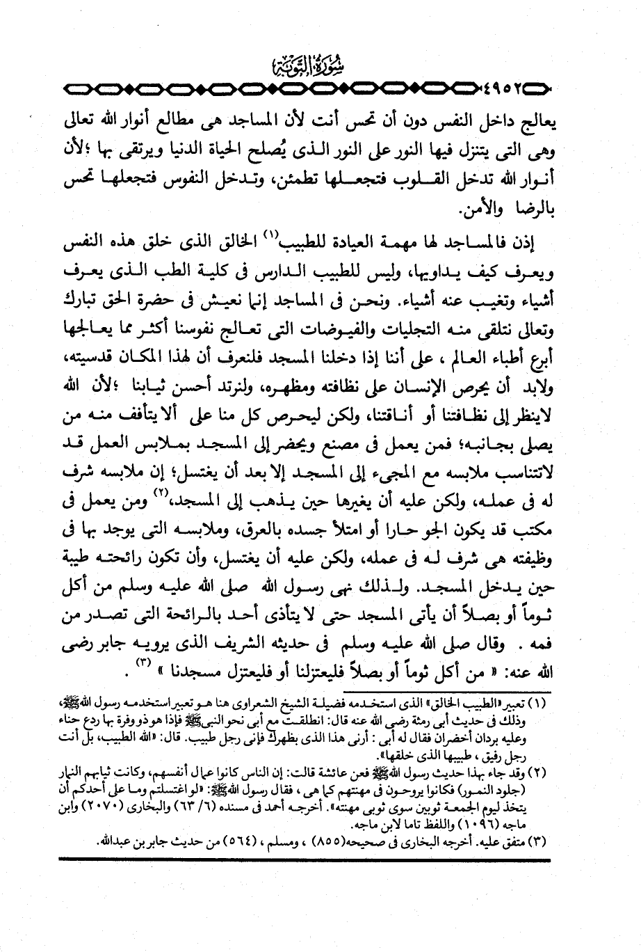 إذن فالمساجد لها مهمة العيادة للطبيب الخالق الذي خلق هذه النفس ويعرف كيف يداويها، وليس للطبيب الدارس في كلية الطب الذي يعرف أشياء وتغيب عنه أشياء. ونحن في المساجد إنما نعيش في حضرة الحق تبارك وتعالى نتلقى منه التجليات والفيوضات التي تعالج نفوسنا أكثر مما يعالجها أبرع أطباء العالم، على أننا إذا دخلنا المسجد فلنعرف أن لهذا المكان قدسيته، ولا بد أن يحرص الإنسان على نظافته ومظهره، ولنرتد أحسن ثيابنا؛ لأن الله لا ينظر إلى نظافتنا أو أناقتنا، ولكن ليحرص كل منا ألا يتأفف منه من يصلي بجانبه؛ فمن يعمل في مصنع ويحضر إلى المسجد إلا بعد أن يغتسل؛ إن ملابسه شرف له في عمله، ولكن عليه أن يغيرها حين يذهب إلى المسجد، ومن يعمل في مكتب قد يكون الجو حارا أو امتلأ جسده بالعرق، وملابسه التي يوجد بها في وظيفته هي شرف له في عمله، ولكن عليه أن يغتسل، وأن تكون رائحته طيبة حين يدخل المسجد.