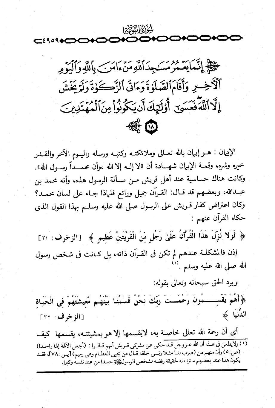 الإيمان: هو إيمان بالله تعالى وملائكته وكتبه ورسله واليوم الآخر والقدر خيره وشره، وقمة الإيمان شهادة أن «لا إله إلا الله، وأن محمداً رسول الله» . وكانت هناك حساسية عند أهل قريش من مسألة الرسول هذه، وأنه محمد بن عبد الله، وبعضهم قد قال: القرآن جميل ورائع فلماذا جاء على لسان محمد؟ وكان اعتراض كفار قريش على الرسول صَلَّى اللَّهُ عَلَيْهِ وَسَلَّم َ بهذا القول الذي حكاه القرآن عنهم: {لَوْلاَ نُزِّلَ هذا القرآن على رَجُلٍ مِّنَ القريتين عَظِيمٍ} [الزخرف: 31] .