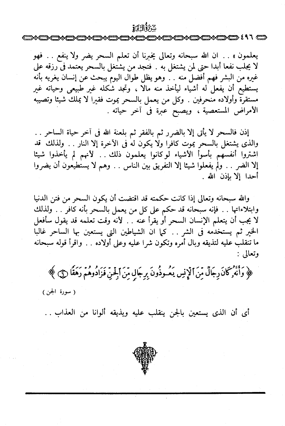 والله سبحانه وتعالى إذا كانت حكمته قد اقتضت أن يكون السحر من فتن الدنيا وابتلاءاتها. . فإنه سبحانه قد حكم على كل من يعمل بالسحر بأنه كافر. . ولذلك لا يجب أن يتعلم الإنسان السحر أو يقرأ عنه. . لأنه وقت تعلمه قد يقول سأفعل الخير ثم يستخدمه في الشر. . كما أن الشياطين التي يستعين بها الساحر غالبا ما تنقلب عليه لتذيقه وبال أمره وتكون شرا عليه وعلى أولاده. . واقرأ قوله سبحانه وتعالى: {وَأَنَّهُ كَانَ رِجَالٌ مِّنَ الإنس يَعُوذُونَ بِرِجَالٍ مِّنَ الجن فَزَادُوهُمْ رَهَقاً} [الجن: 6]
