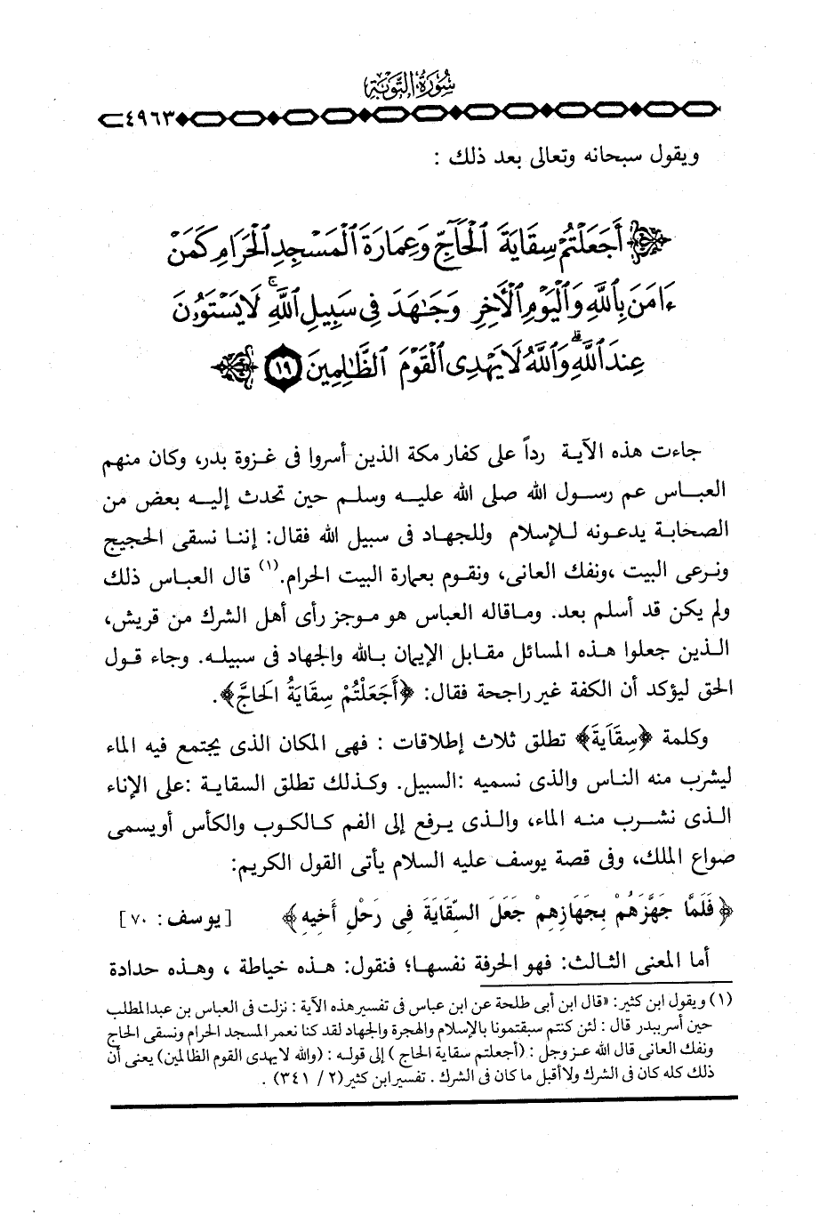 ويقول الحق سبحانه وتعالى بعد ذلك: {أَجَعَلْتُمْ سِقَايَةَ الحاج وَعِمَارَةَ المسجد الحرام كَمَنْ آمَنَ بالله واليوم الآخر وَجَاهَدَ فِي سَبِيلِ الله ... }