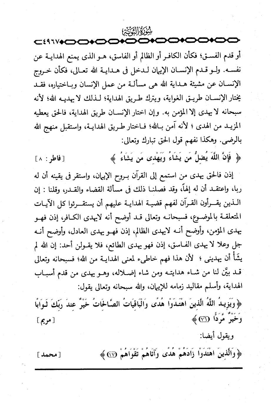 ولو قدم الإنسان الإيمان لدخل في هداية الله تعالى، فكأن خروج الإنسان عن مشيئة هداية الله هي مسألة من عمل الإنسان وباختياره، فقد يختار الإنسان طريق الغواية، ويترك طريق الهداية؛ لذلك لا يهديه الله؛ لأنه سبحانه لا يهدي إلا المؤمن به. وإن اختار الإنسان طريق الهداية، فالحق يعطيه المزيد من الهدى؛ لأنه آمن بالله؛ فاختار طريق الهداية، واستقبل منهج الله بالرضى. وهكذا نفهم قول الحق تبارك وتعالى: {فَإِنَّ الله يُضِلُّ مَن يَشَآءُ وَيَهْدِي مَن يَشَآءُ} [فاطر: 8] .