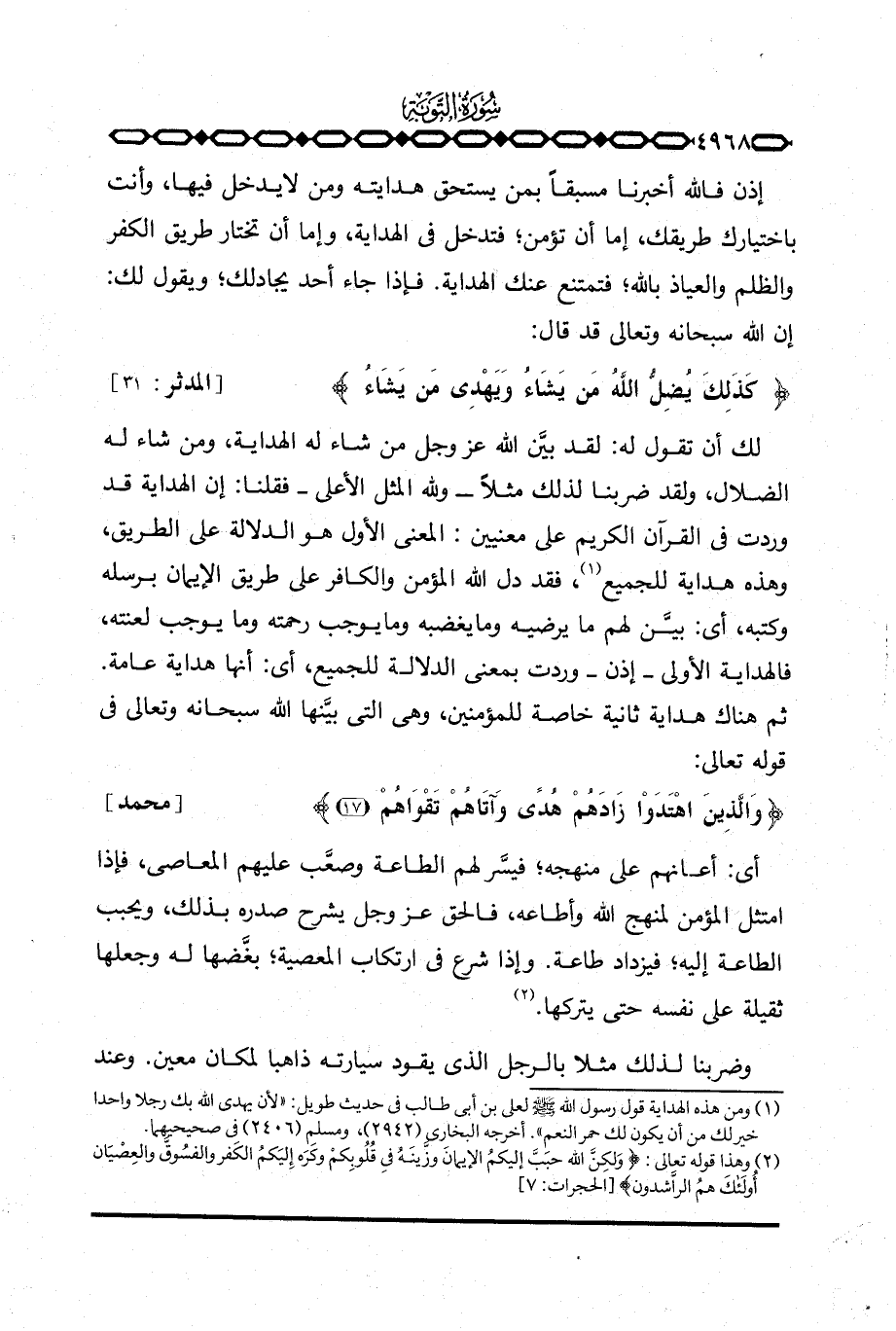لك أن تقول له: لقد بيَّن الله عَزَّ وَجَلَّ من شاء له الهداية، ومن شاء له الضلال، ولقد ضربنا لذلك مثلاً - ولله المثل الأعلى - فقلنا: إن الهداية قد وردت في القرآن الكريم على معنيين: المعنى الأول هو الدلالة على الطريق، وهذه هداية للجميع، فقد دل الله المؤمن والكافر على طريق الإيمان برسله وكتبه، أي: بيَّن لهم ما يرضيه وما يغضبه وما يوجب رحمته وما يوجب لعنته، فالهداية الأولى - إذن - وردت بمعنى الدلالة للجميع، أي: أنها هداية عامة. ثم هناك هداية ثانية خاصة للمؤمنين، وهي التي بيَّنها الله سبحانه وتعالى في قوله تعالى:
