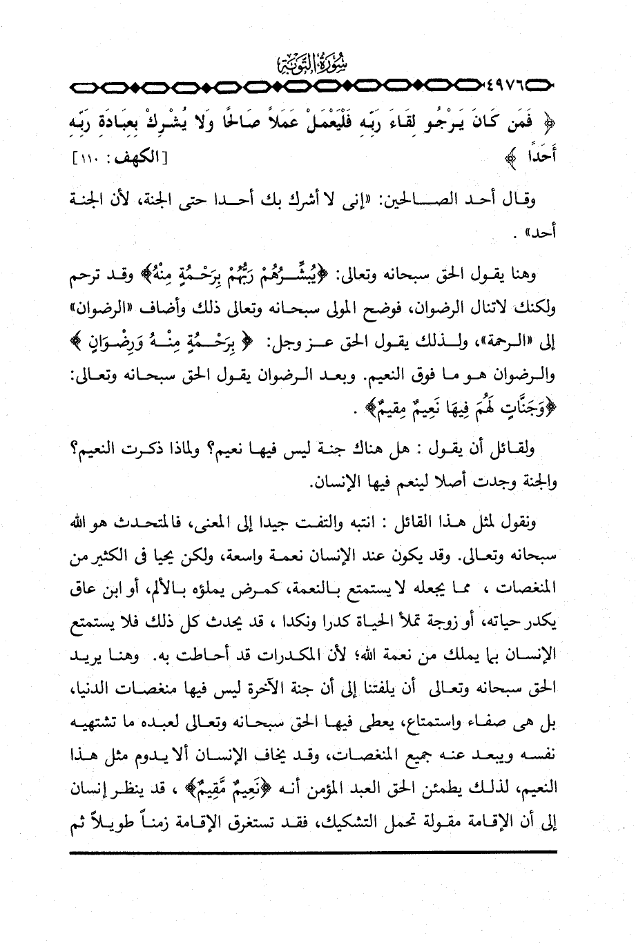 {فَمَن كَانَ يَرْجُواْ لِقَآءَ رَبِّهِ فَلْيَعْمَلْ عَمَلاً صَالِحاً وَلاَ يُشْرِكْ بِعِبَادَةِ رَبِّهِ أَحَدَاً} [الكهف: 110] .