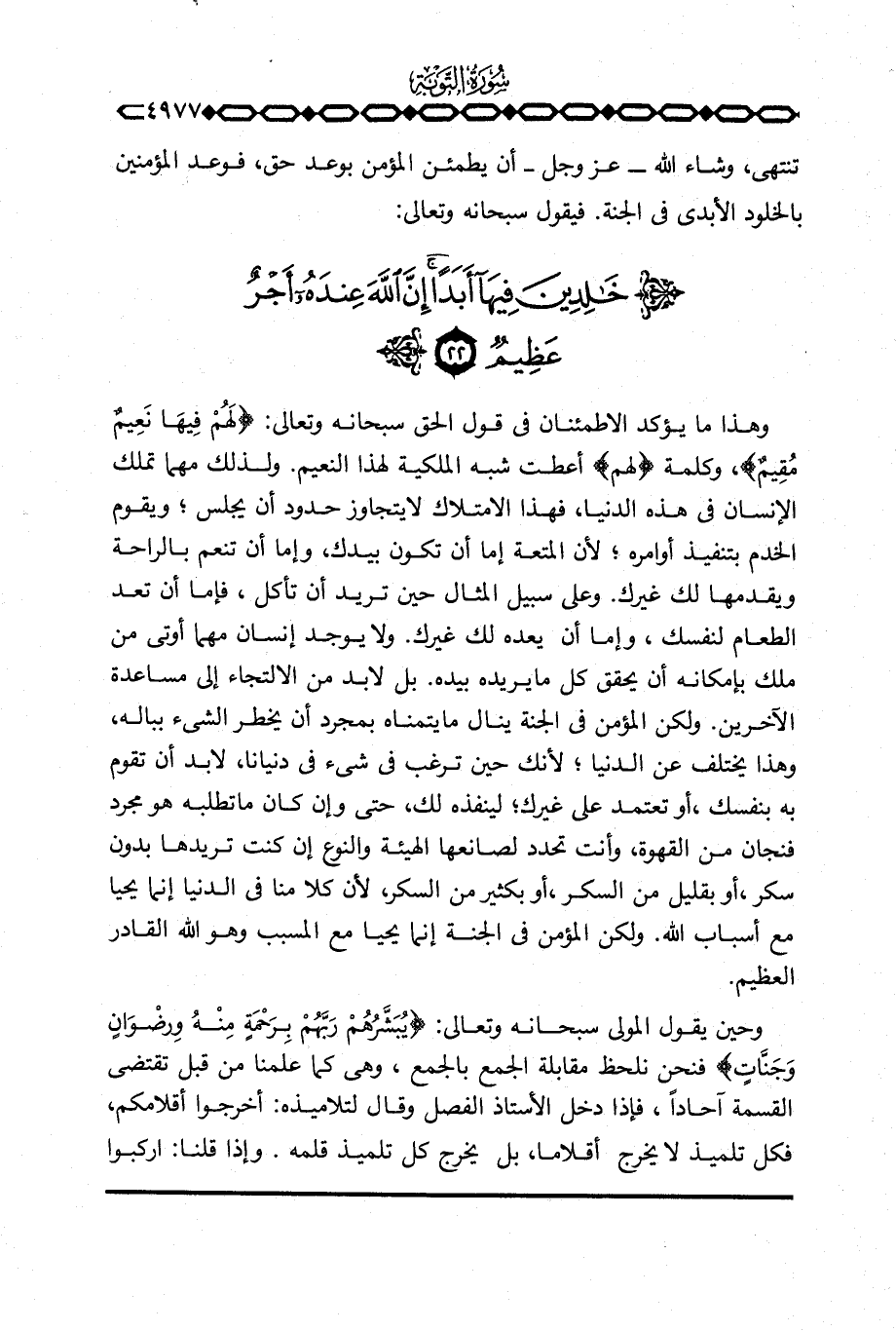 تنتهي، وشاء الله - عَزَّ وَجَلَّ - أن يطمئن المؤمن بوعد حق، فوعد المؤمنين بالخلود الأبدي في الجنة. فيقول سبحانه وتعالى: {خالدين فِيهَآ أَبَداً إِنَّ الله عِندَهُ أَجْرٌ عَظِيمٌ ... }
