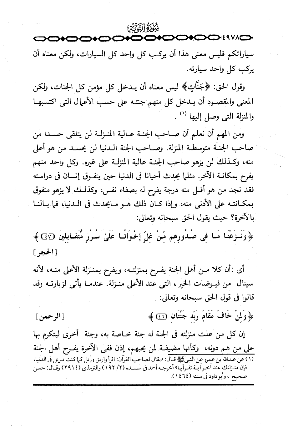 ومن المهم أن نعلم أن صاحب الجنة عالية المنزلة لن يتلقى حسدا من صاحب الجنة متوسطة المنزلة. وصاحب الجنة الدنيا لن يحسد من هو أعلى منه، وكذلك لن يزهو صاحب الجنة عالية المنزلة على غيره. وكل واحد منهم يفرح بمكانة الآخر. مثلما يحدث أحيانا في الدنيا حين يتفوق إنسان في دراسته فقد نجد من هو أقل منه درجة يفرح له بصفاء نفس، وكذلك لا يزهو متفوق بمكانته على الأدنى منه، وإذا كان ذلك هو ما يحدث في الدنيا، فما بالنا بالآخرة؟ حيث يقول الحق سبحانه وتعالى: {وَنَزَعْنَا مَا فِي صُدُورِهِم مِّنْ غِلٍّ إِخْوَاناً على سُرُرٍ مُّتَقَابِلِينَ} [الحجر: 47] .