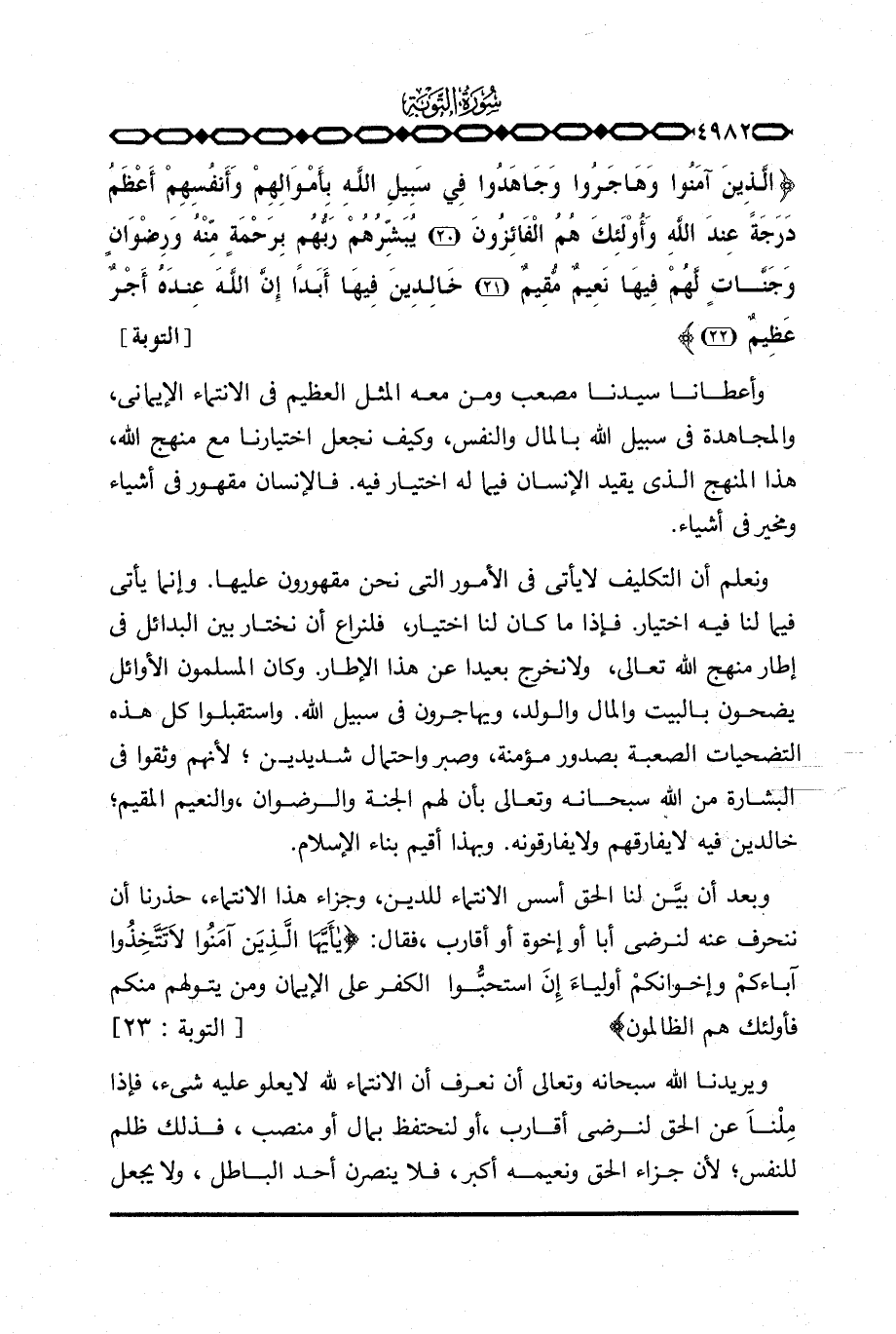 ونعلم أن التكليف لا يأتي في الأمور التي نحن مقهورون عليها. وإنما يأتي فيما لنا فيه اختيار. فإذا ما كان لنا اختيار، فلنراع أن نختار بين البدائل في إطار منهج الله تعالى، ولا نخرج بعيدا عن هذا الإطار. وكان المسلمون الأوائل يضحون بالبيت والمال والولد، ويهاجرون في سبيل الله. واستقبلوا كل هذه التضحيات الصعبة بصدور مؤمنة، وصبر واحتمال شديدين؛ لأنهم وثقوا في البشارة من الله سبحانه وتعالى بأن لهم الجنة والرضوان، والنعيم المقيم؛ خالدين فيه لا يفارقهم ولا يفارقونه. وبهذا أقيم بناء الإسلام.