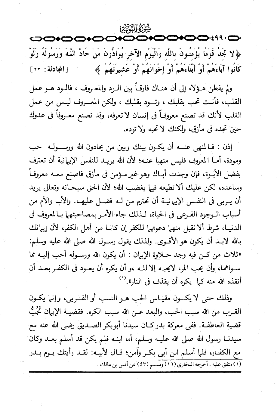 {لاَّ تَجِدُ قَوْماً يُؤْمِنُونَ بالله واليوم الآخر يُوَآدُّونَ مَنْ حَآدَّ الله وَرَسُولَهُ وَلَوْ كانوا آبَآءَهُمْ أَوْ أَبْنَآءَهُمْ أَوْ إِخْوَانَهُمْ أَوْ عَشِيرَتَهُمْ} [المجادلة: 22] .