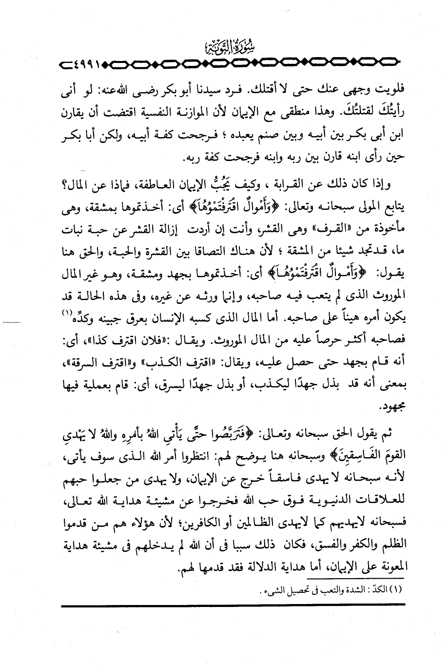 وإذا كان ذلك عن القرابة، وكيف يَجُبُّ الإيمان العاطفة، فماذا عن المال؟ يتابع المولى سبحانه وتعالى: {وَأَمْوَالٌ اقترفتموها} أي: أخذتموها بمشقة، وهي مأخوذة من «القرف» وهي القشر، وأنت إن أردت إزالة القشر عن حبة نبات ما، قد تجد شيئا من المشقة؛ لأن هناك التصاقا بين القشرة والحبة، والحق هنا يقول: {وَأَمْوَالٌ اقترفتموها} أي: أخذتموها بجهد ومشقة، وهو غير المال الموروث الذي لم يتعب فيه صاحبه، وإنما ورثه عن غيره، وفي هذه الحالة قد يكون أمره هيناً على صاحبه. أما المال الذي كسبه الإنسان بعرق جبينه وكدِّه فصاحبه أكثر حرصاً عليه من المال الموروث. ويقال: «فلان اقترف كذا» ، أي: أنه قام بجهد حتى حصل عليه، ويقال: «اقترف الكذب» و «اقترف السرقة» ، بمعنى أنه قد بذل جهدًا ليكذب، أو بذل جهدًا ليسرق، أي: قام بعملية فيها مجهود.