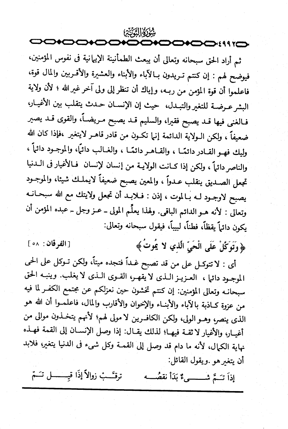 ثم أراد الحق سبحانه وتعالى أن يبعث الطمأنينة الإيمانية في نفوس المؤمنين، فيوضح لهم: إن كنتم تريدون بالآباء والأبناء والعشيرة والأقربين والمال قوة، فاعلموا أن قوة المؤمن من ربه، وإياك أن تنظر إلى ولي آخر غير الله؛ لأن ولاية البشر عرضة للتغير والتبدل، حيث إن الإنسان حدث يتقلب بين الأغيار، فالغني فيها قد يصبح فقيرا، والسليم قد يصبح مريضاً، والقوي قد يصير ضعيفاً، ولكن الولاية الدائمة إنما تكون من قادر قاهر لا يتغير، فإذا كان الله وليك فهو القادر دائمًا، والقاهر دائمًا، والغالب دائمًا، والموجود دائماً، والناصر دائماً، ولكن إذا كانت الولاية من إنسان لإنسان فالأغيار في الدنيا تجعل الصديق ينقلب عدواً، والمعين يصبح ضعيفاً لا يملك شيئا، والموجود يصبح لا وجود له بالموت، إذن: فلا بد أن تجعل ولايتك مع الله سبحانه وتعالى: لأنه هو الدائم الباقي. ولهذا يعلِّم المولى - عَزَّ وَجَلَّ - عبده المؤمن أن يكون دائماً يقظاً، فطناً، لبيباً، فيقول سبحانه وتعالى: {وَتَوَكَّلْ عَلَى الحي الذي لاَ يَمُوتُ} [الفرقان: 58] .