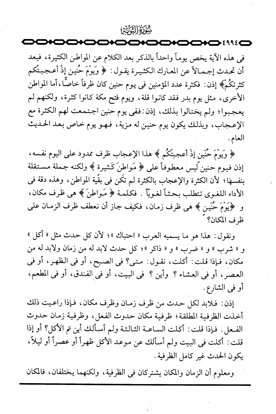 {وَيَوْمَ حُنَيْنٍ إِذْ أَعْجَبَتْكُمْ} هذا الإعجاب ظرف ممدود على اليوم نفسه، إذن فيوم حنين ليس معطوفاً على {مَوَاطِنَ كَثِيرَةٍ} ولكنه جملة مستقلة بنفسها؛ لأن الكثرة والإعجاب بالكثرة لم تكن في بقية المواطن، وهذه دقة في الأداء اللغوي تتطلب بحثاً لغويّاً. فكلمة {مَوَاطِنَ} هي ظرف مكان، و {يَوْمَ حُنَيْنٍ} هي ظرف زمان، فكيف جاز أن نعطف ظرف الزمان على ظرف المكان؟