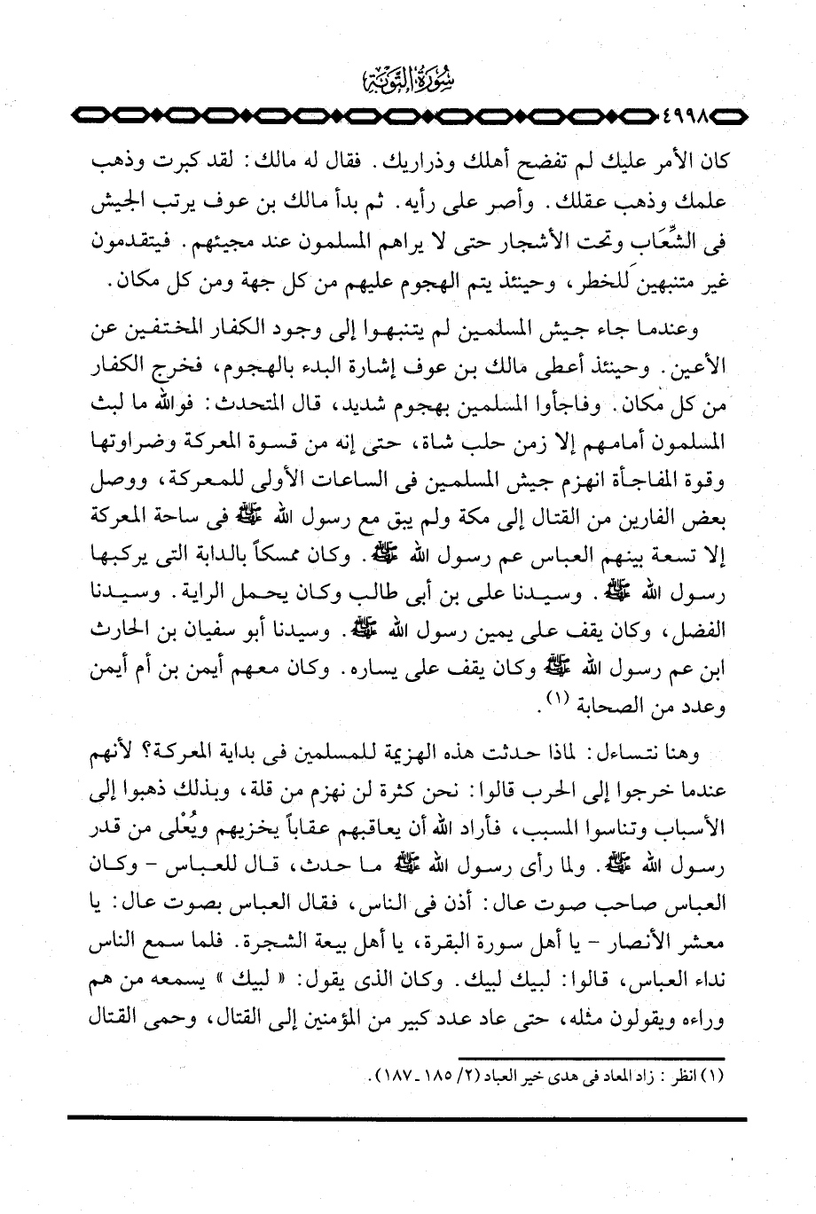 وهنا نتساءل: لماذا حدثت هذه الهزيمة للمسلمين في بداية المعركة؟ لأنهم عندما خرجوا إلى الحرب قالوا: نحن كثرة لن نهزم من قلة، وبذلك ذهبوا إلى الأسباب وتناسوا المسبب، فأراد الله أن يعاقبهم عقاباً يخزيهم ويُعْلي من قدر رسول الله صَلَّى اللَّهُ عَلَيْهِ وَسَلَّم َ. ولما رأى رسول الله صَلَّى اللَّهُ عَلَيْهِ وَسَلَّم َ ما حدث، قال العباس - وكان العباس صاحب صوت عال: أذن في الناس، فقال العباس بصوت عال: يا معشر الأنصار - يا أهل سورة البقرة، يا أهل بيعة الشجرة. فلما سمع الناس نداء العباس، قالوا: لبيك لبيك. وكان الذي يقول: «لبيك» يسمعه من هم وراءه ويقولون مثله، حتى عاد عدد كبير من المؤمنين إلى القتال، وحمى القتال