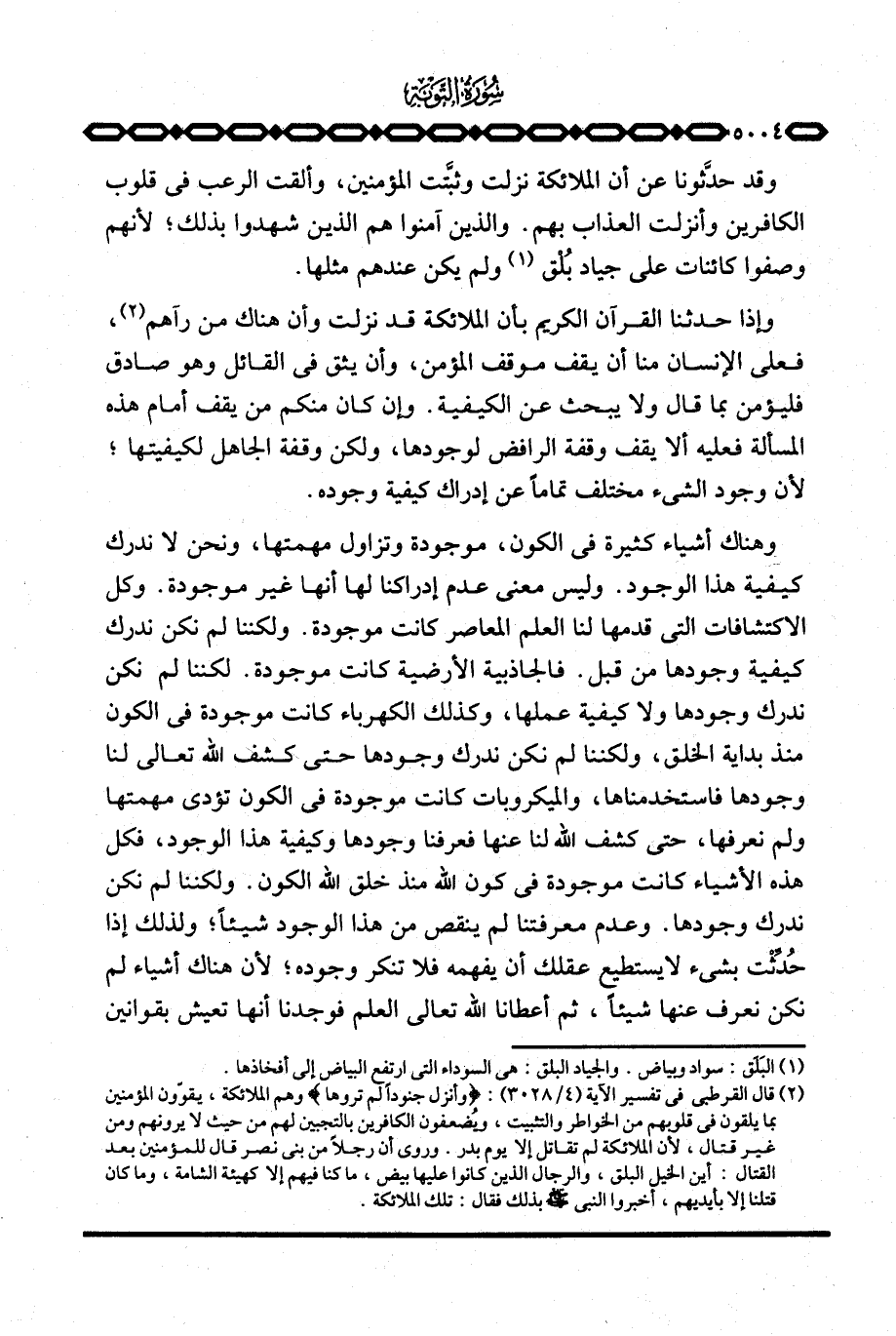 وإذا حدثنا القرآن الكريم بأن الملائكة قد نزلت وأن هناك من رآهم، فعلى الإنسان منا أن يقف موقف المؤمن، وأن يثق في القائل وهو صادق فليؤمن بما قال ولا يبحث عن الكيفية. وإن كان منكم من يقف أمام هذه المسألة فعليه ألا يقف وقفة الرافض لوجودها، ولكن وقفة الجاهل لكيفيتها؛ لأن وجود الشيء مختلف تماماً عن إدراك كيفية وجوده.
