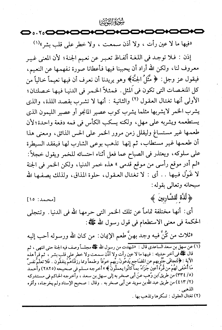 إذن: فلا توجد في اللغة ألفاظ تعبر عن نعيم الجنة؛ لأن المعنى غير معروف لنا، ولكن الله أراد أن يحببنا فيها فأعطانا صورة نفهمها عن النعيم، فيقول عَزَّ وَجَلَّ: {مَّثَلُ الجنة} وهو يريدنا أن نعرف أن فيها نعيماً خالياً من كل المنغصات التي تكون في المثل. فمثلاً الخمر في الدنيا فيها خصلتان؛ الأولى أنها تغتال العقول والثانية: أنها لا تشرب بقصد اللذة، والذي يشرب الخمر لا يشربها مثلما يشرب كوب عصير المانجو أو عصير الليمون الذي يستطعمه ويشربه على مهل، ولكنه يسكب الكأس في فمه دفعة واحدة؛ لأن طعمها غير مستساغ وليقلل زمن مرور الخمر على الحس الذائق، ومعنى هذا أن طعمها غير مستطاب، ثم إنها تذهب بوعي الشارب لها فيفقد السيطرة على سلوكه، ويعتذر في الصباح عما فعل أثناء احتسائه للخمر ويقول خجلاً: «لم أدر موقع رأسي من موقع قدمي» هذه خمر الدنيا، ولكن الخمر في الجنة لا غَوْل فيها.