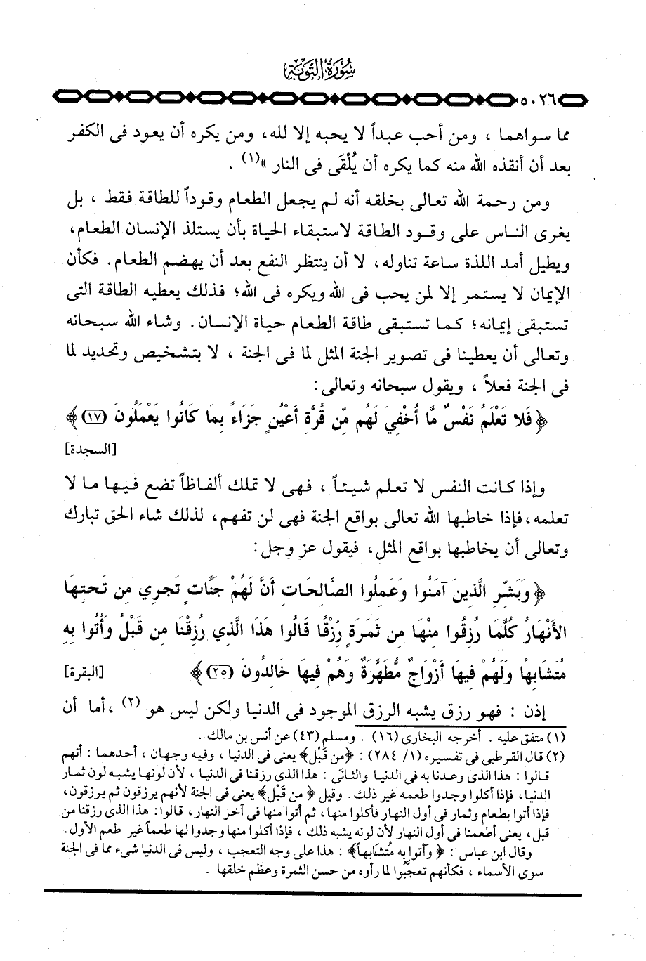 ومن رحمة الله تعالى بخلقه أنه لم يجعل الطعام وقوداً للطاقة فقط، بل يغري الناس على وقود الطاقة لاستبقاء الحياة بأن يستلذ الإنسان الطعام، ويطيل أمد اللذة ساعة تناوله، لا أن ينتظر النفع بعد أن يهضم الطعام. فكأن الإيمان لا يستمر إلا لمن يحب في الله ويكره في الله؛ فذلك يعطيه الطاقة التي تستبقي إيمانه، كما تستبقي طاقة الطعام حياة الإنسان. وشاء الله سبحانه وتعالى أن يعطينا في تصوير الجنة المثل لما في الجنة، لا بتشخيص وتحديد لما في الجنة فعلاً، ويقول سبحانه وتعالى: {فَلاَ تَعْلَمُ نَفْسٌ مَّآ أُخْفِيَ لَهُم مِّن قُرَّةِ أَعْيُنٍ جَزَآءً بِمَا كَانُواْ يَعْمَلُونَ} [السجدة: 17] .
