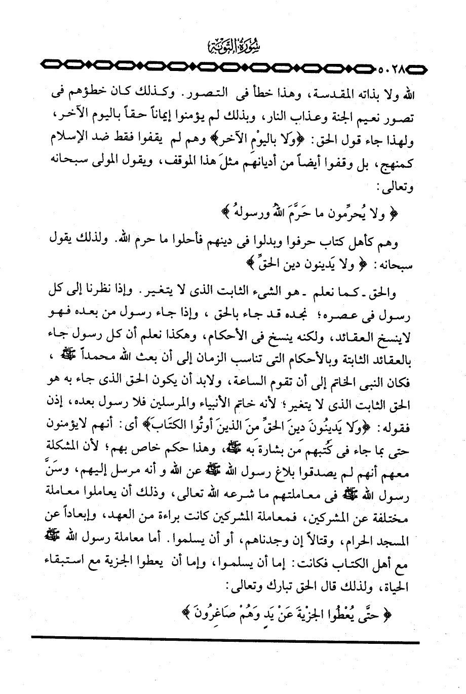 والحق - كما نعلم - هو الشيء الثابت الذي لا يتغير. وإذا نظرنا إلى كل رسول في عصره؛ نجده قد جاء بالحق، وإذا جاء رسول من بعده فهو لا ينسخ العقائد، ولكنه ينسخ في الأحكام، وهكذا نعلم أن كل رسول جاء بالعقائد الثابتة وبالأحكام التي تناسب الزمان إلى أن بعث الله محمداً صَلَّى اللَّهُ عَلَيْهِ وَسَلَّم َ، فكان النبي الخاتم إلى أن تقوم الساعة، ولا بد أن يكون الحق الذي جاء به هو الحق الثابت الذي لا يتغير؛ لأنه خاتم الأنبياء والمرسلين فلا رسول بعده، إذن فقوله: {وَلاَ يَدِينُونَ دِينَ الحق مِنَ الذين أُوتُواْ الكتاب} أي: أنهم لا يؤمنون حتى بما جاء في كتبهم من بشارة به صَلَّى اللَّهُ عَلَيْهِ وَسَلَّم َ، وهذا حكم خاص بهم؛ لأن المشكلة معهم أنهم لم يصدقوا بلاغ رسول الله صَلَّى اللَّهُ عَلَيْهِ وَسَلَّم َ عن الله وأنه مرسل إليهم، وسَنَّ رسول الله صَلَّى اللَّهُ عَلَيْهِ وَسَلَّم َ في معاملتهم ما شرعه الله تعالى، وذلك أن يعاملوا معاملة مختلفة عن المشركين، فمعاملة المشركين كانت براءة من العهد، وإبعاداً عن المسجد الحرام وقتالاً إن وجدناهم، أو أن يسلموا.
