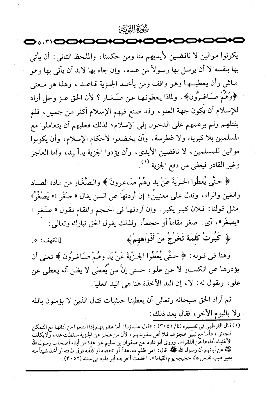 {حتى يُعْطُواْ الجزية عَن يَدٍ وَهُمْ صَاغِرُونَ} والصَّغَار من مادة الصاد والغين والراء، وتدل على معنيين؛ إن أردتها عن السن يقال «صَغُر» «يَصْغُرُ» مثل قولنا: فلان كبر يكبر. وإن أردتها في الحجم والمقام نقول «صَغِر» «يصغَر» ، أي: صغر مقاماً أو حجماً، ولذلك يقول الحق تبارك وتعالى: {كَبُرَتْ كَلِمَةً تَخْرُجُ مِنْ أَفْوَاهِهِمْ} [الكهف: 5] .