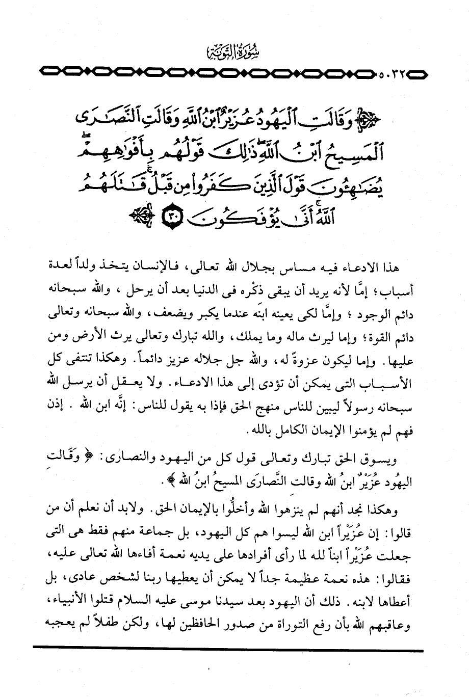 وهكذا نجد أنهم لم ينزهوا الله وأخلُّوا بالإيمان الحق. ولا بد أن نعلم أن من قالوا: إن عُزَيْراً ابن الله ليسوا هم كل اليهود، بل جماعة منهم فقط هي التي جعلت عُزَيْراً ابناً لله لما رأى أفرادها على يديه نعمة أفاءها الله تعالى عليه، فقالوا: هذه نعمة عظيمة جداً لا يمكن أن يعطيها ربنا لشخص عادي، بل أعطاها لابنه. ذلك أن اليهود بعد سيدنا موسى عليه السلام قتلوا الأنبياء، وعاقبهم الله بأن رفع التوراة من صدور الحافظين لها، ولكن طفلاً لم يعجبه