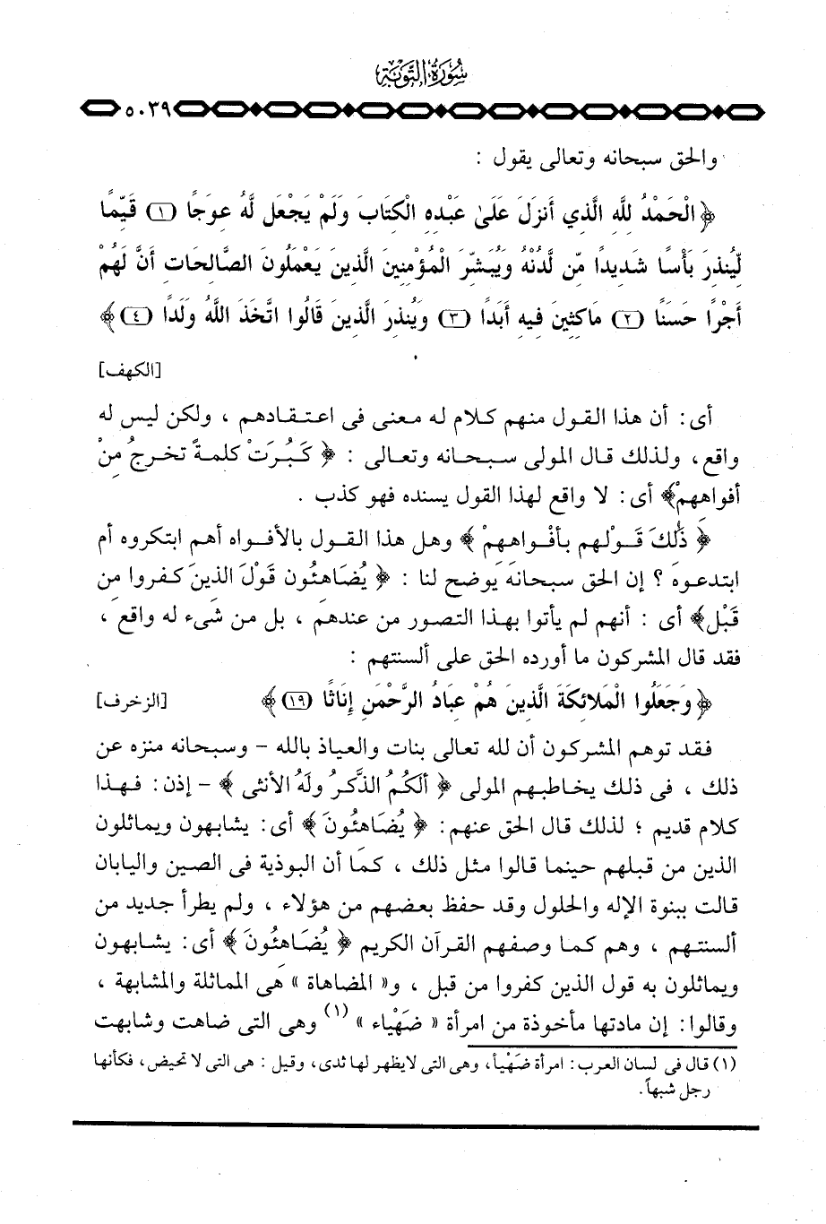 والحق سبحانه وتعالى يقول: {الحمد لِلَّهِ الذي أَنْزَلَ على عَبْدِهِ الكتاب وَلَمْ يَجْعَل لَّهُ عِوَجَا قَيِّماً لِّيُنْذِرَ بَأْساً شَدِيداً مِّن لَّدُنْهُ وَيُبَشِّرَ المؤمنين الذين يَعْمَلُونَ الصالحات أَنَّ لَهُمْ أَجْراً حَسَناً مَّاكِثِينَ فِيهِ أَبَداً وَيُنْذِرَ الذين قَالُواْ اتخذ الله وَلَداً} [الكهف: 1 - 4] .