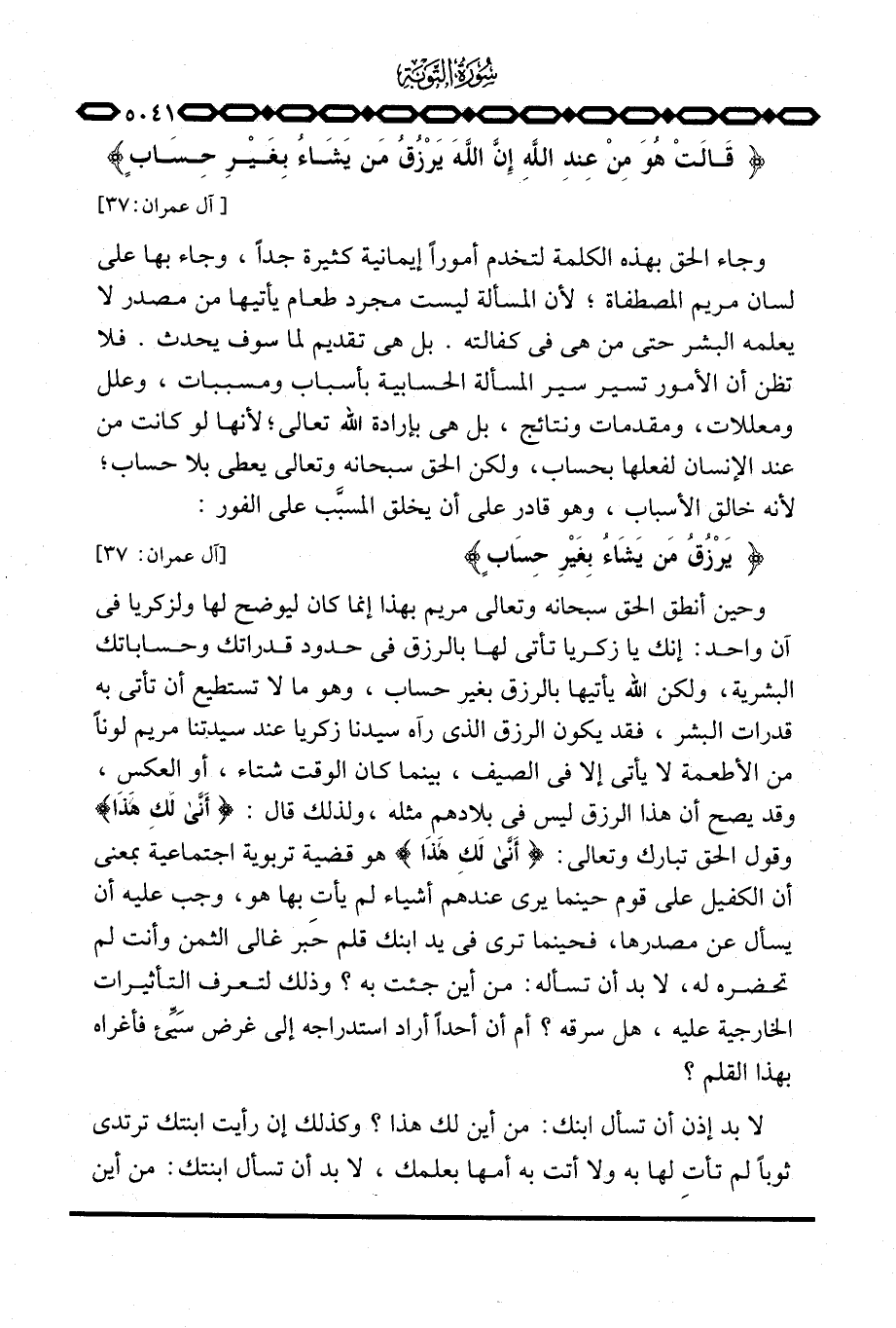 وحين أنطق الحق سبحانه وتعالى مريم بهذا إنما كان ليوضح لها ولزكريا في آن واحد: إنك يا زكريا تأتي لها بالرزق في حدود قدراتك وحساباتك البشرية، ولكن الله يأتيها بالرزق بغير حساب، وهو ما تستطيع أن تأتي به قدرات البشر، فقد يكون الرزق الذي رآه سيدنا زكريا عند سيدتنا مريم لوناً من الأطعمة لا يأتي إلا في الصيف، بينما كان الوقت شتاء، أو العكس، وقد يصح أن هذا الرزق ليس في بلادهم مثله، ولذلك قال: {أنى لَكِ هذا} وقول الحق تبارك وتعالى: {أنى لَكِ هذا} هو قضية تربوية اجتماعية بمعنى أن الكفيل على قوم حينما يرى عندهم أشياء لم يأتِ بها هو، وجب عليه أن يسأل عن مصدرها، فحينما ترى في يد ابنك قلم حبر غالي الثمن وأنت لم تحضره له، لا بد أن تسأله: من أين جئت به؟ وذلك لتعرف التأثيرات الخارجية عليه، هل سرقه؟ أم أن أحداً أراد استدراجه إلى غرض سَيِّئ فأغراه بهذا القلم؟